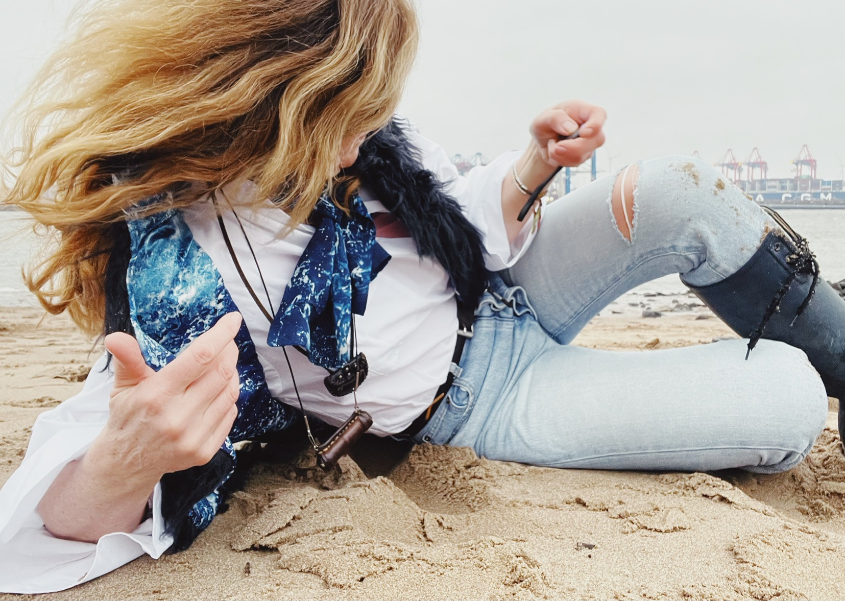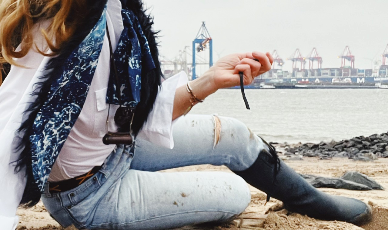 Stellen wir uns vor, der Sand unter mir ist warm, weich und viel heller, als dieser hier, beinahe weiß ist er, und seine Körner rieseln mir durch die Finger. Stellen wir uns weiter vor, hinter mir fließt nicht die schlamm-braune Elbe, sondern das türkisene Wasser einer Südsee-Lagune. Die Krähne, Container und Schiffe radieren wir auch weg, und knispen noch ein wenig Sonnenlicht an. Fertig ist die perfekte Kulisse für “Waterscape” und Fernweh.