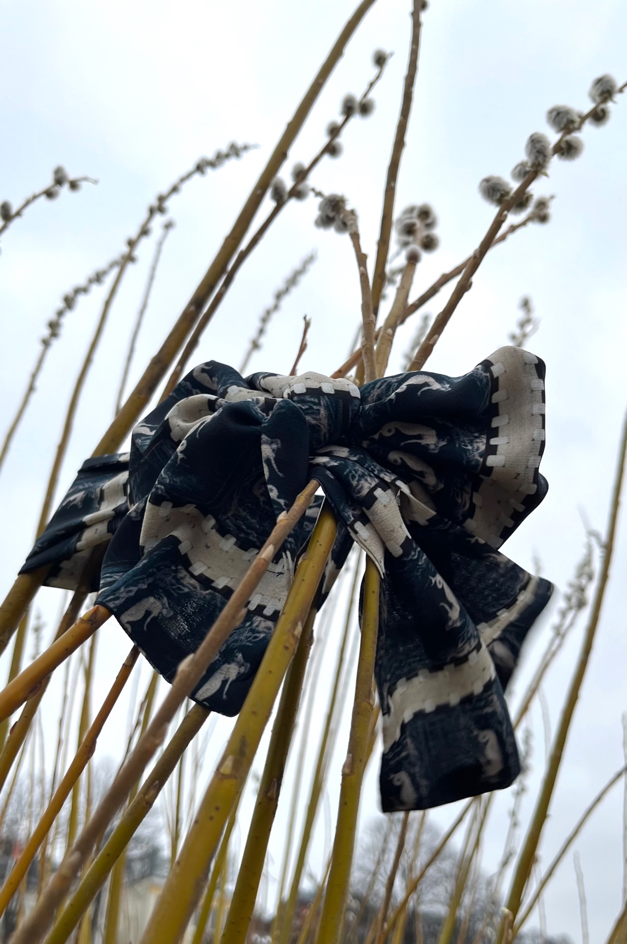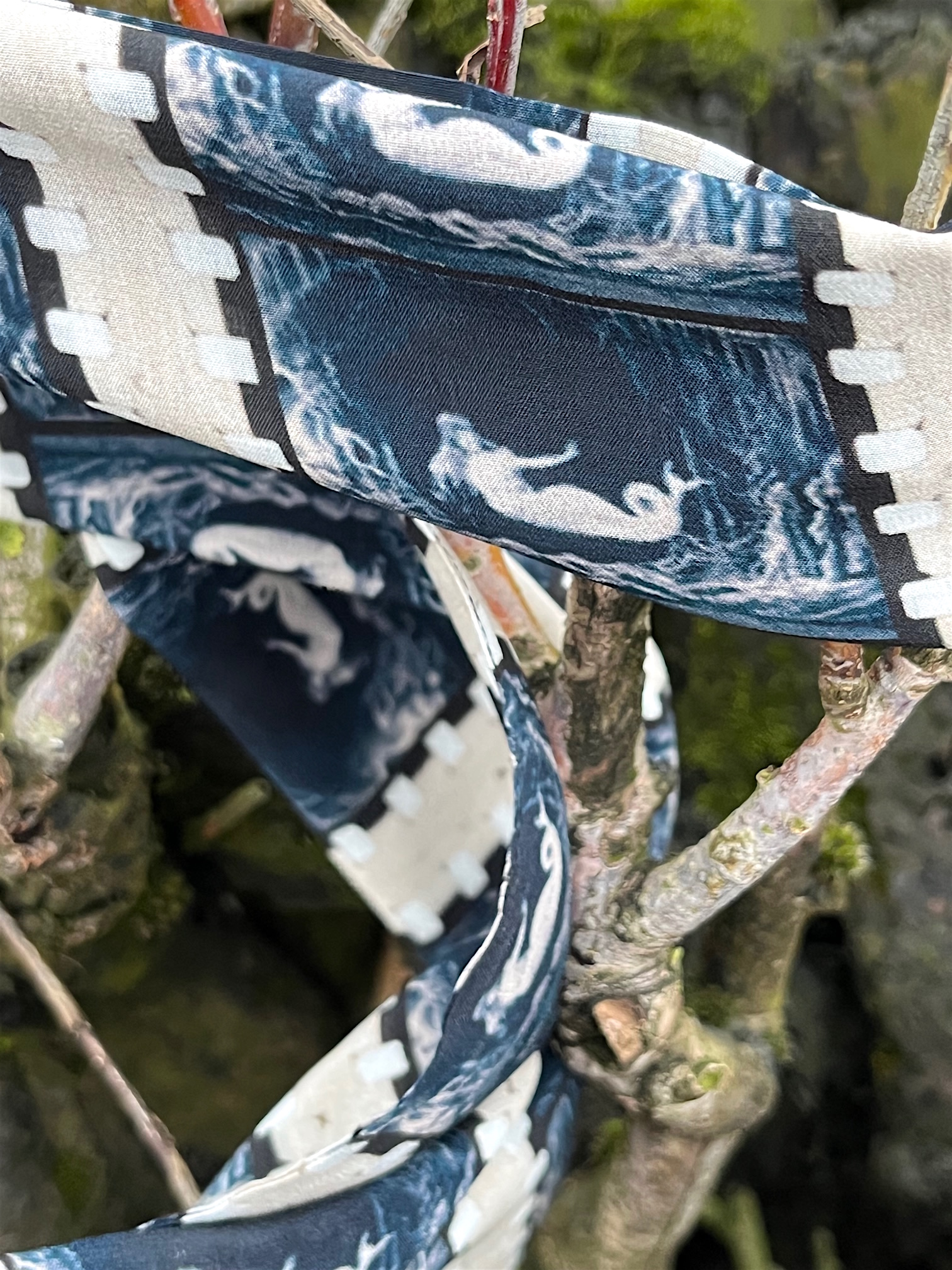 Gefunden haben wir ein Stückchen Crêpe de Chine Seide mit den Motiven von Georges Méliès, dem französischen Pionier der bewegten Bilder, dem Jules Verne des Films und dem Illusionisten der phantastischen Reisen. Eine ganze Kollektion gab es dazu, nun sind noch drei Unikat-Schals entstanden (€ 198).