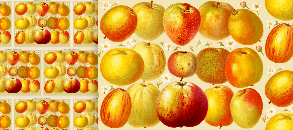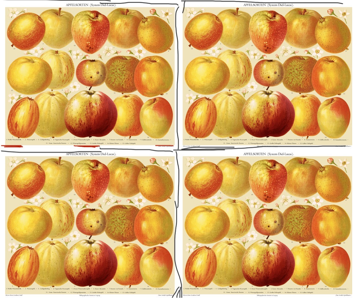 So ist es richtig: Groß die Äpfel mit den Blüten für die Seidenstoffe, und klein die Tafeln als Reihung mit allen Bezeichnungen des Lexikons und dem dazugehörigen Rahmen.