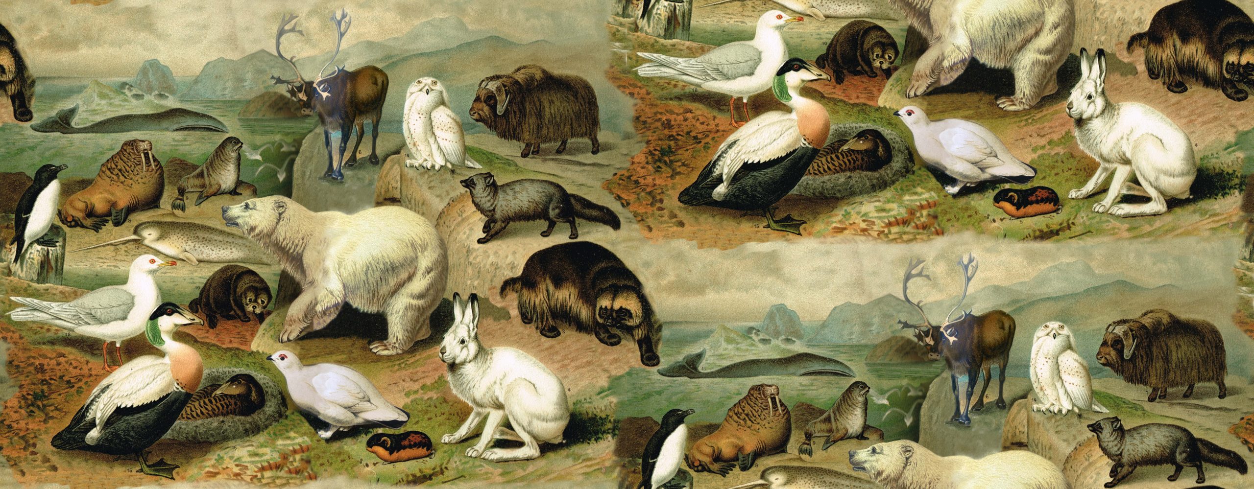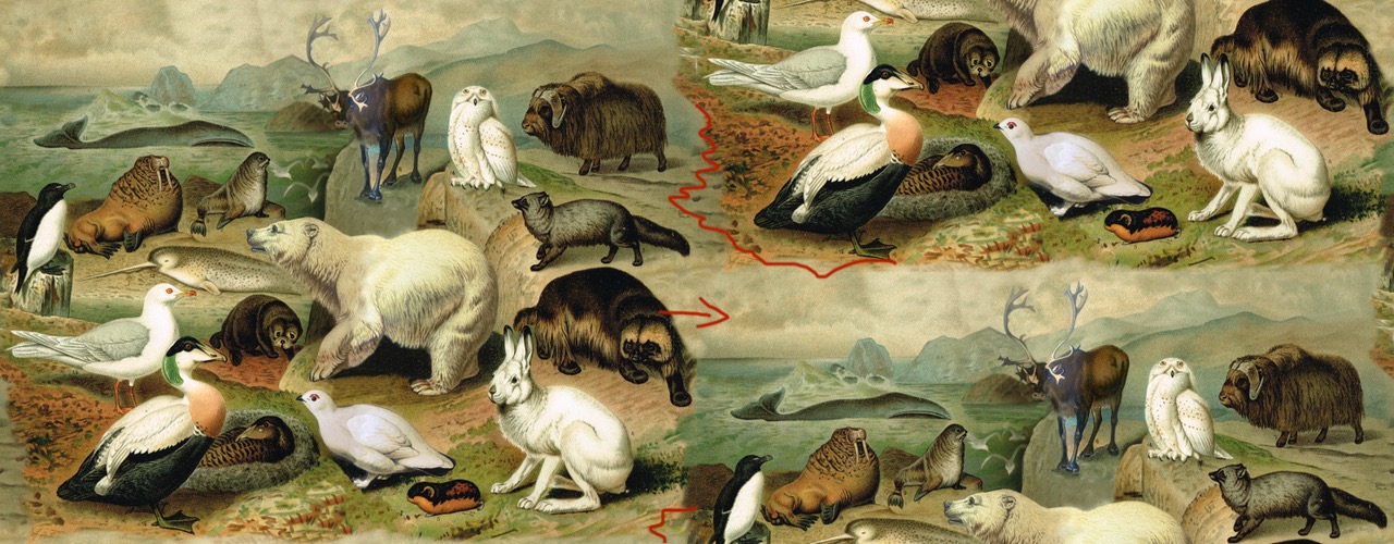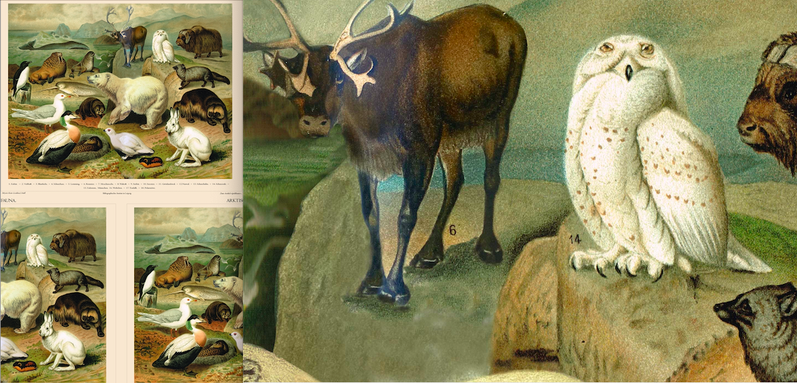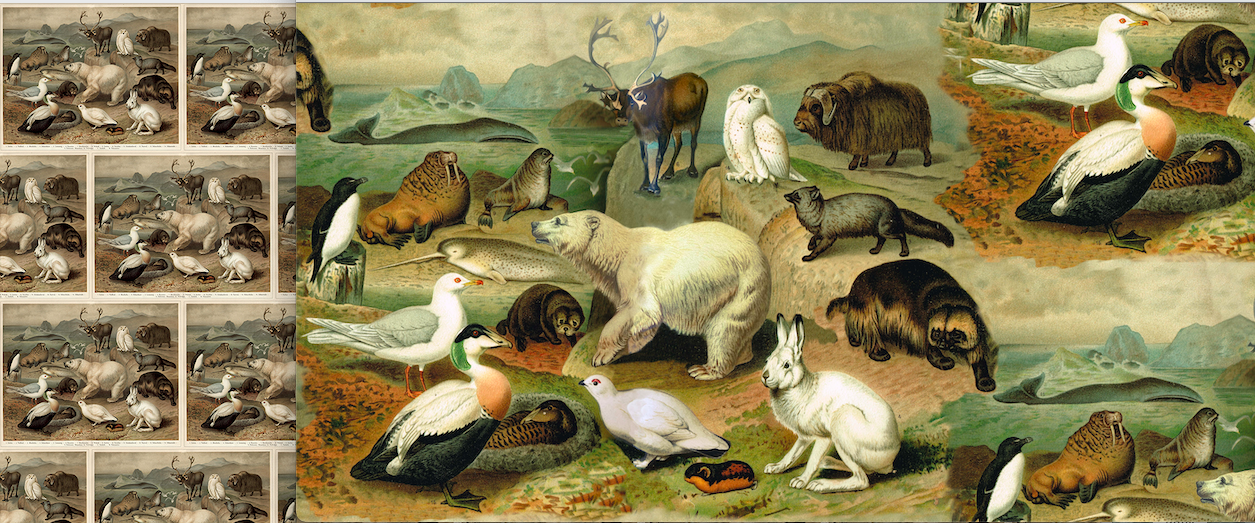 Bei den Tieren bedarf es ebenfall ein paar Korrekturen, damit sich die Elemente besser ineinander verschlingen. Gestein und Moose der Tundra dehnen sich nach links aus. Das braune Fellwesen schiebt sich ein weng nach rechts. Die Farben des Futterstoffes müssen angepasst werden, sie sind zu grau-braun, die Original-Vorlage ist leuchtender mit eisigem Türkis. Fertig! Futter links und Seide rechts. Am Computer stimmt schon mal alles.