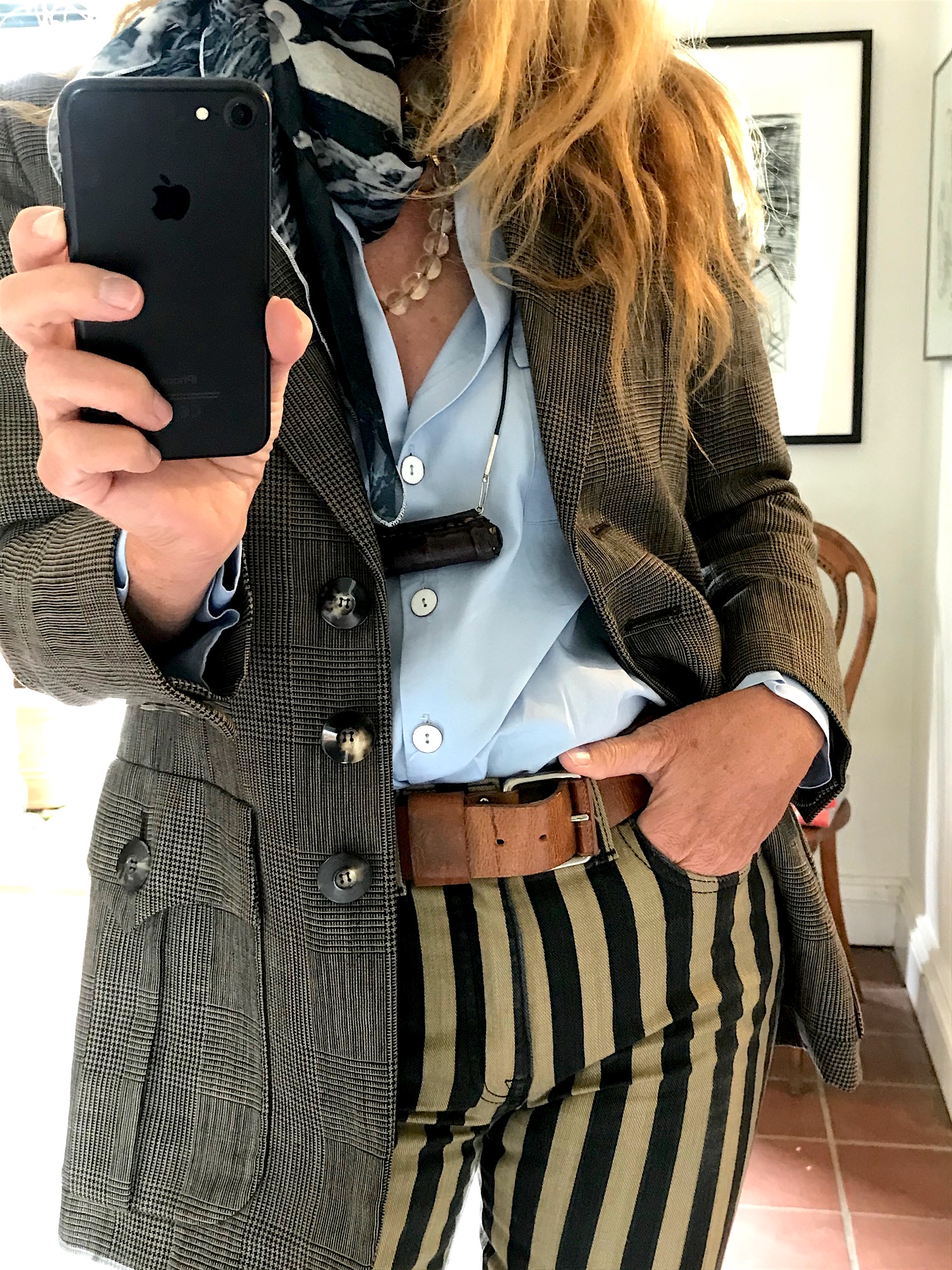 Abb: Blazer Yves Saint Laurent Vintage, Jeans Nili Lotan (USA), Vintage Gürtel hell (€ 189), Kimono Bluse hellblau (€ 298).