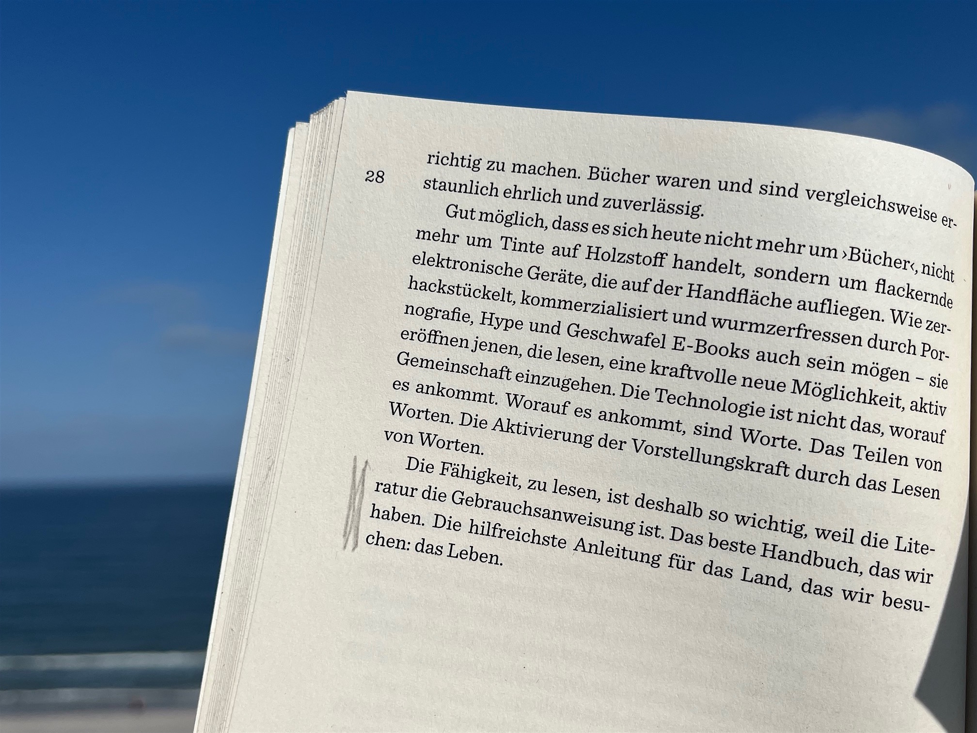 Die Ellenbogen aufgestützt, sitze ich am Schreibtisch, im Fauteuil, im Strandkorb … ist es bei uns nicht ebenso? Ich kenne viele, die nicht (mehr) lesen. Sie hätten dafür keine Zeit, es klingt beinahe abfällig.