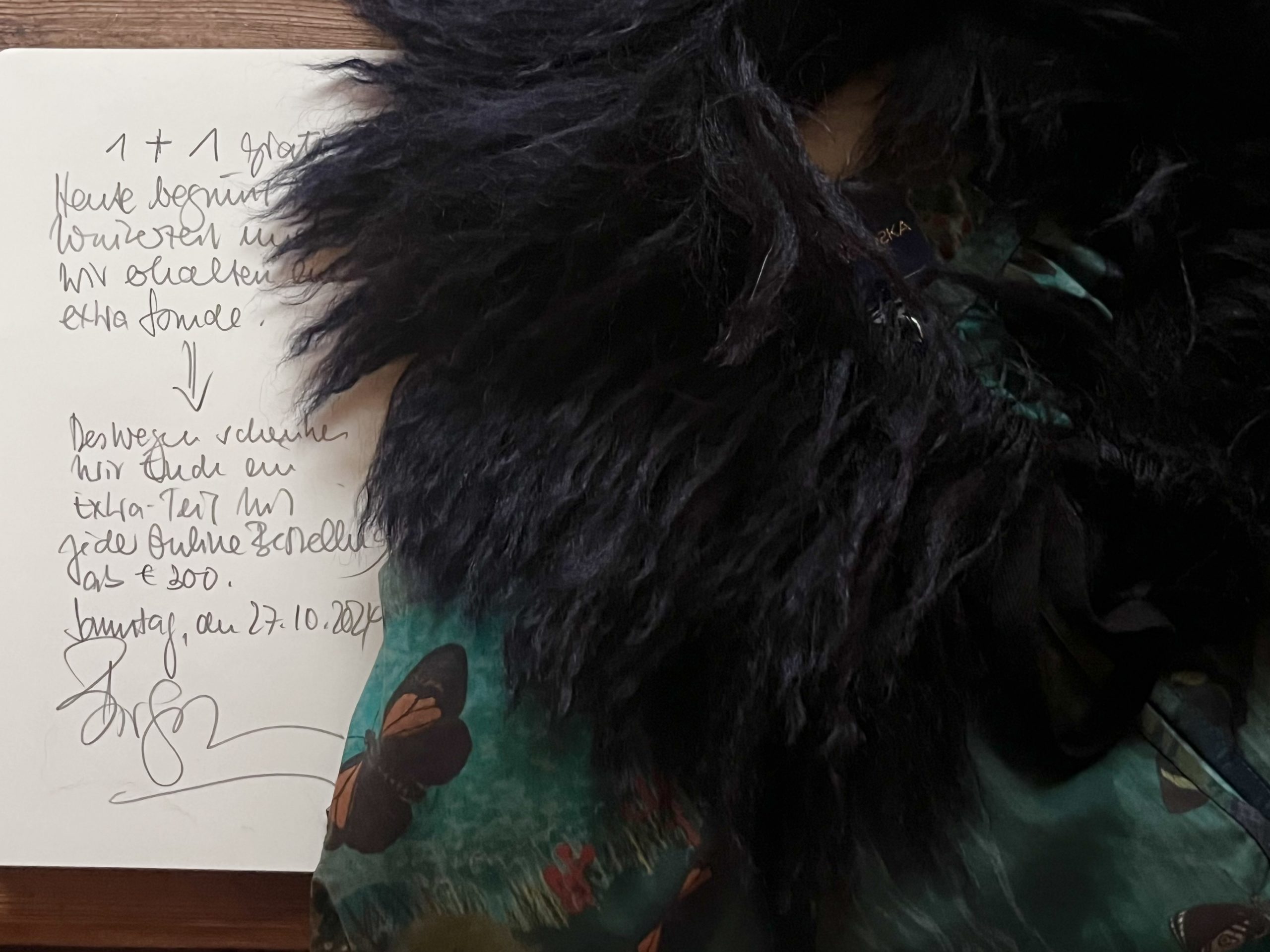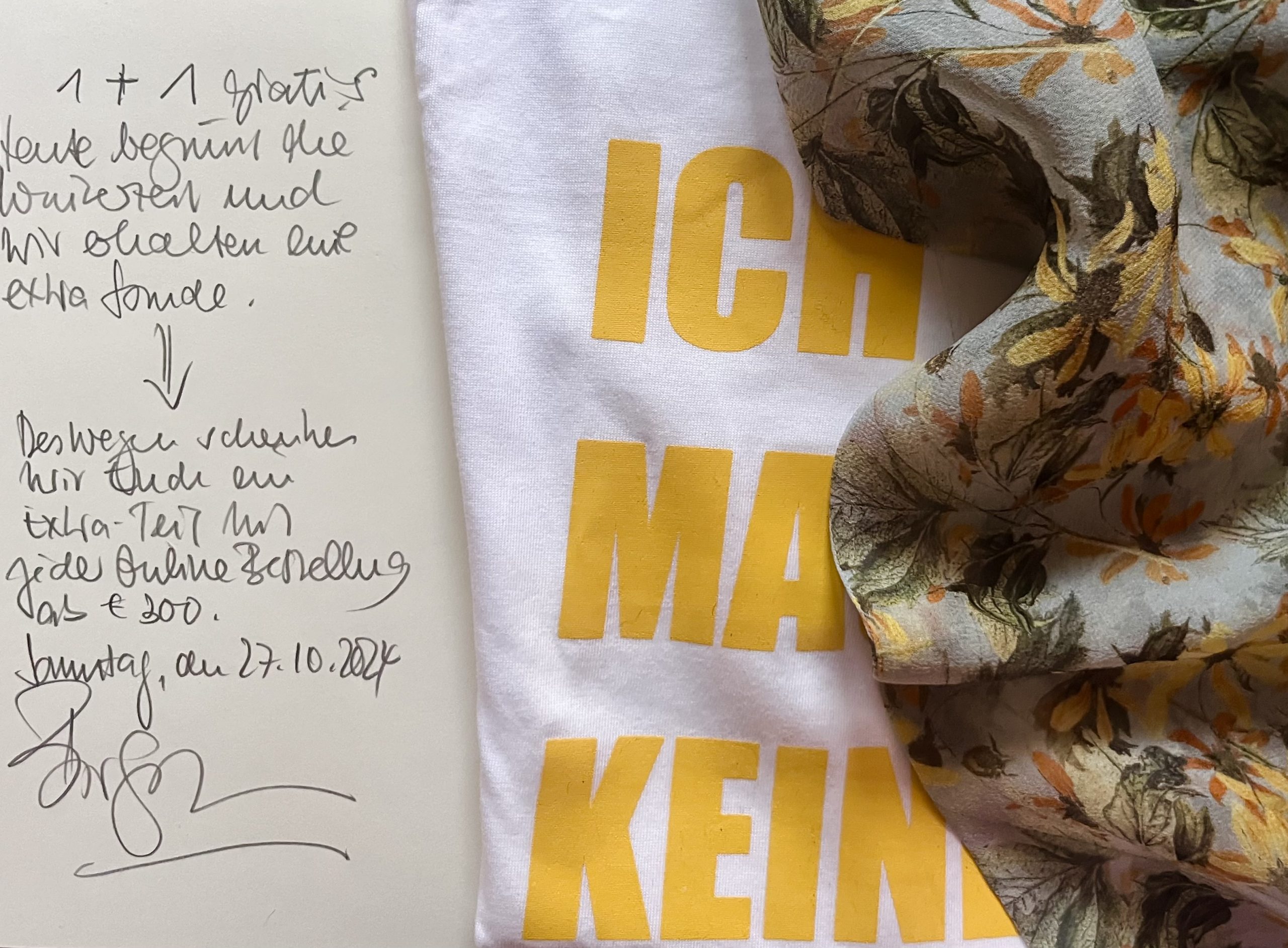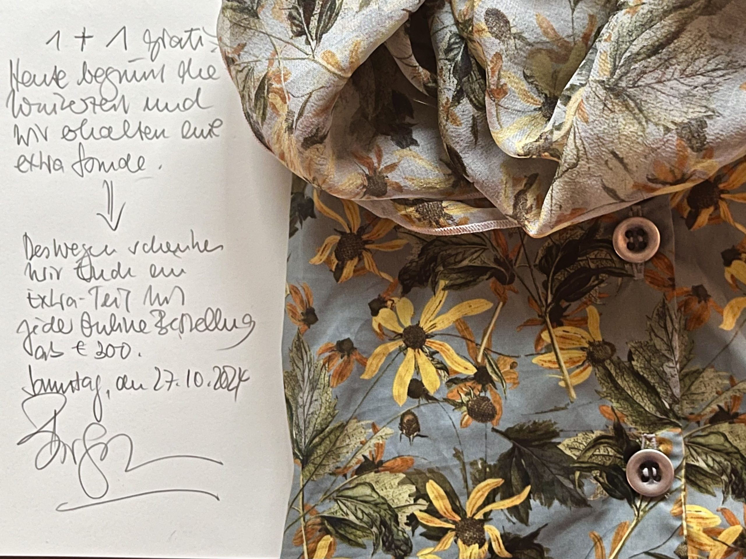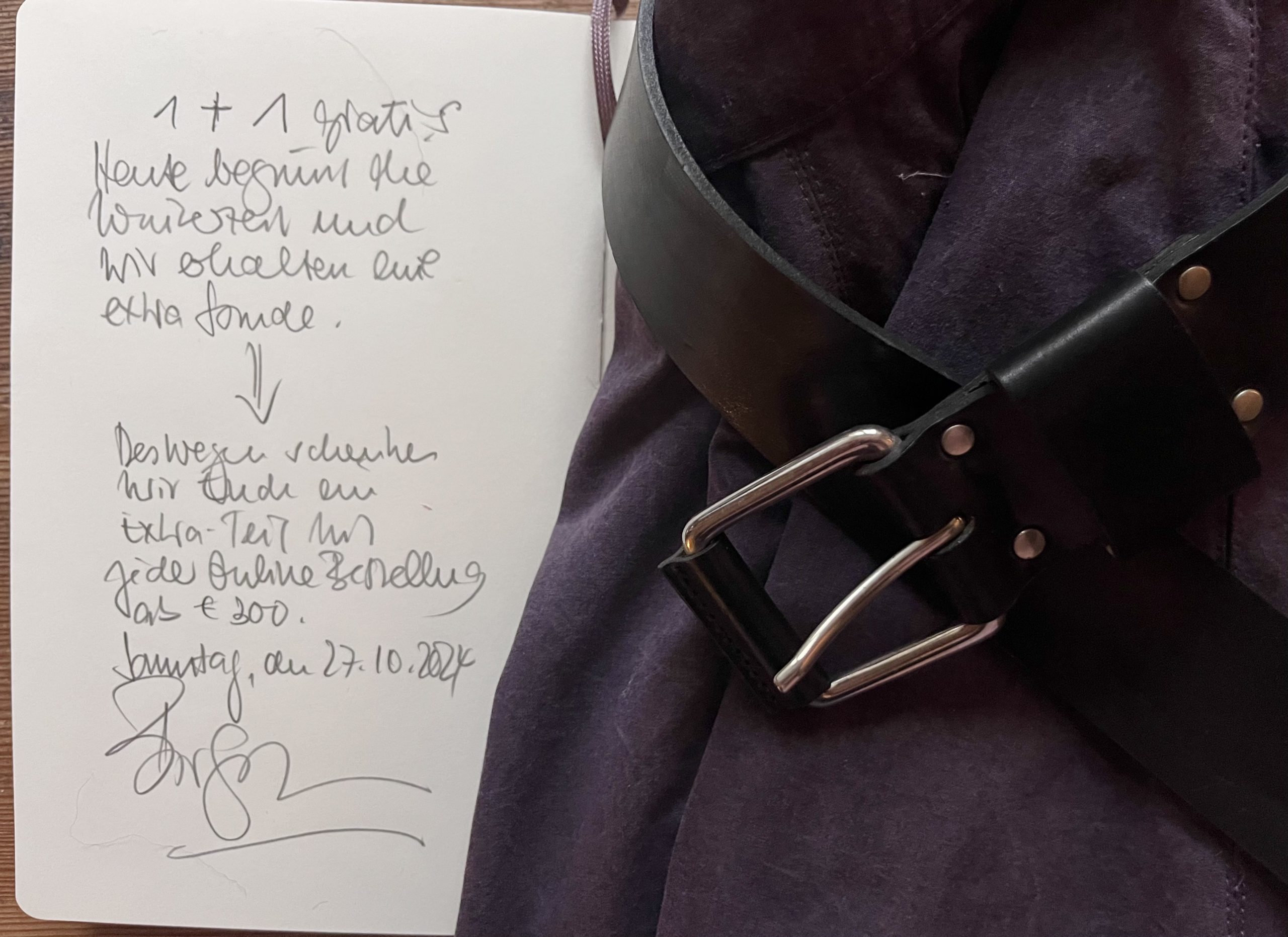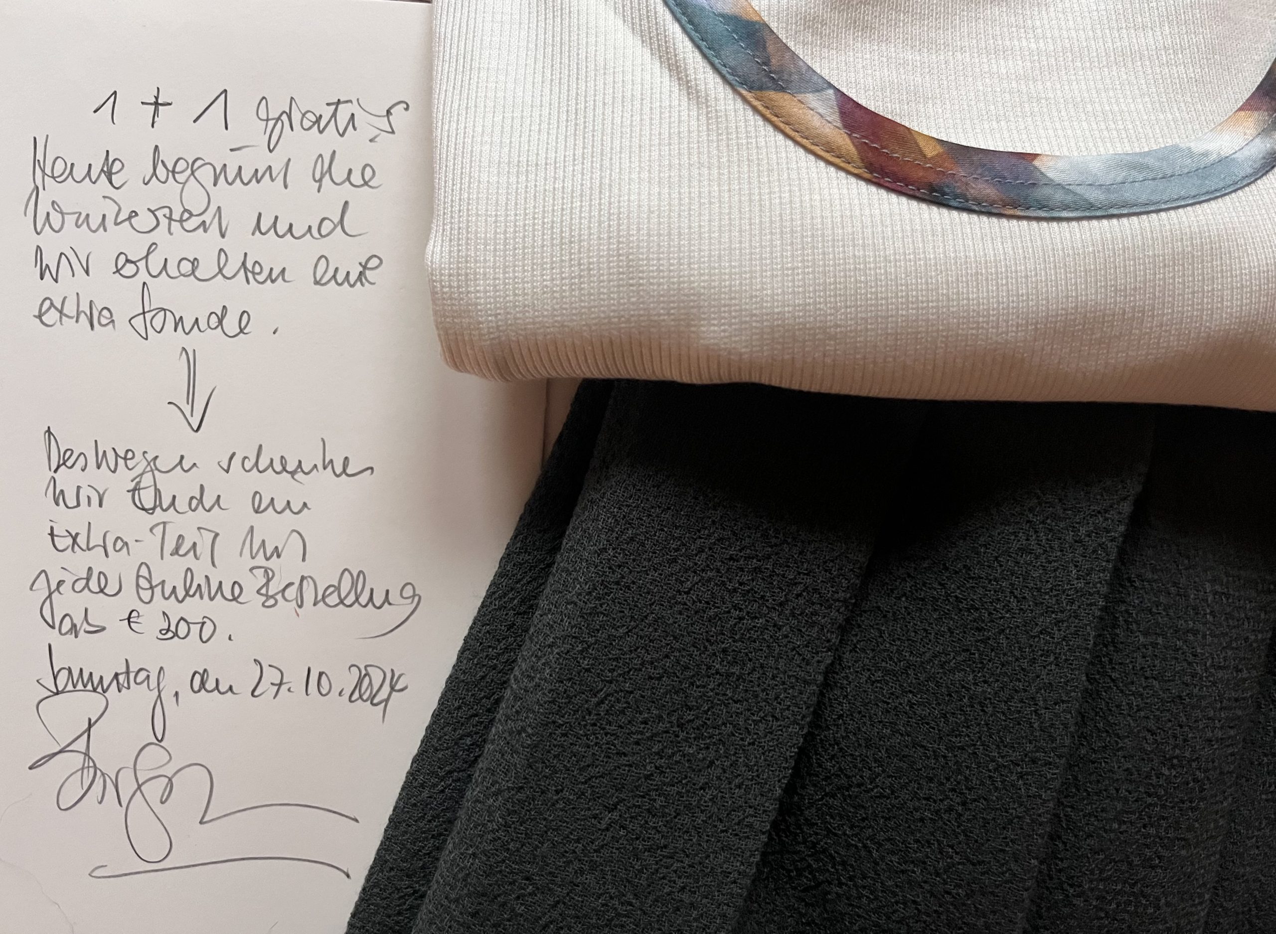 Das bringt mich dazu, Euch heute auch etwas zu schenken: Wer an diesem Sonntag ab einem Warenwert ab € 300 bestellt, erhält gratis dazu ein Shirt, ein kleines Seidentuch (70 x 70 cm), den Echthaar-Webpelz-Fellkragen oder einen der letzten schwarzen Leder-Gürtel: