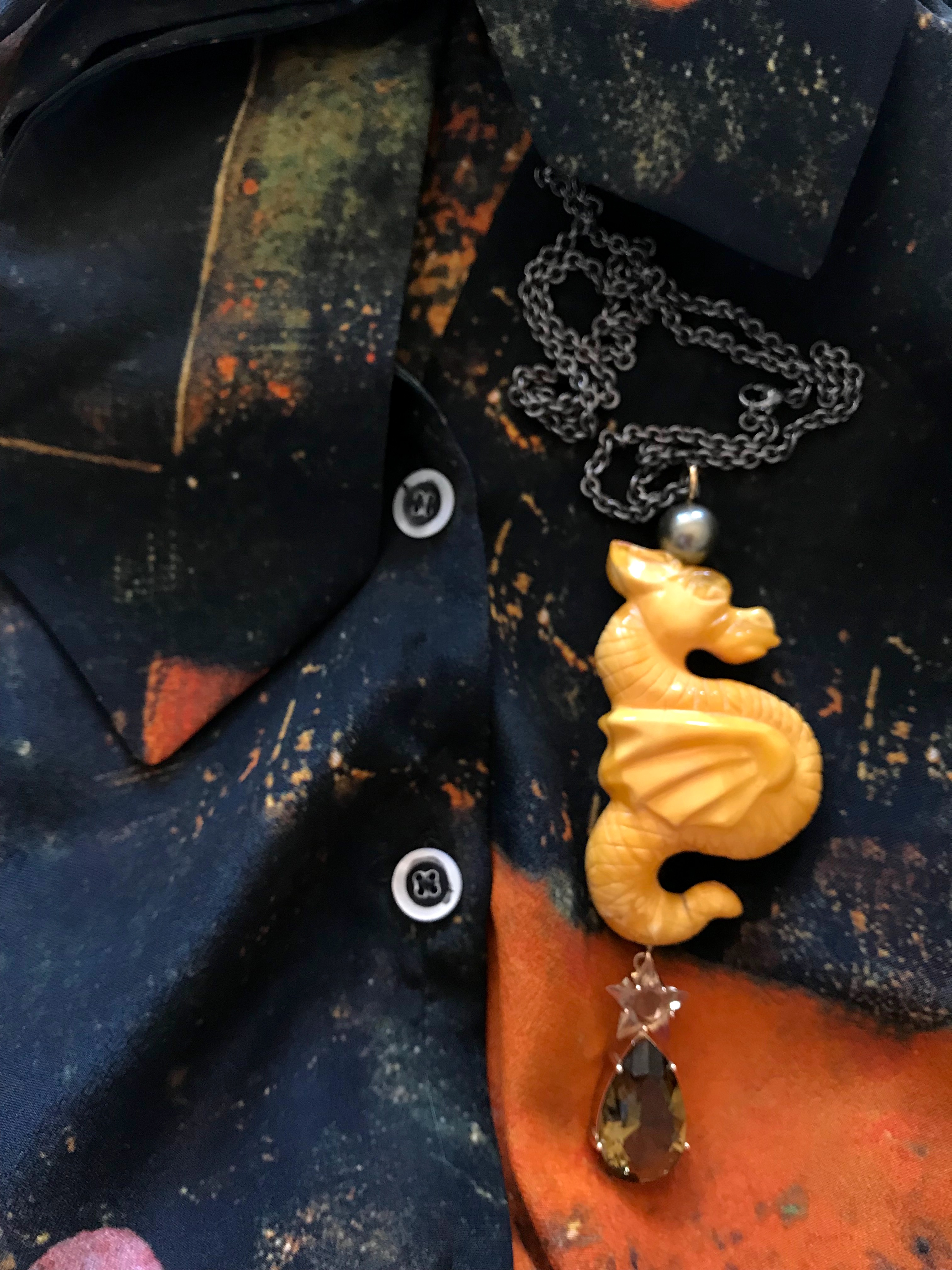 Abb: Puff the magic Dragon. Antiker Bernstein, Tahiti Perlen, Rauchquarz und Champagnerquarz Anhänger. € 3.450