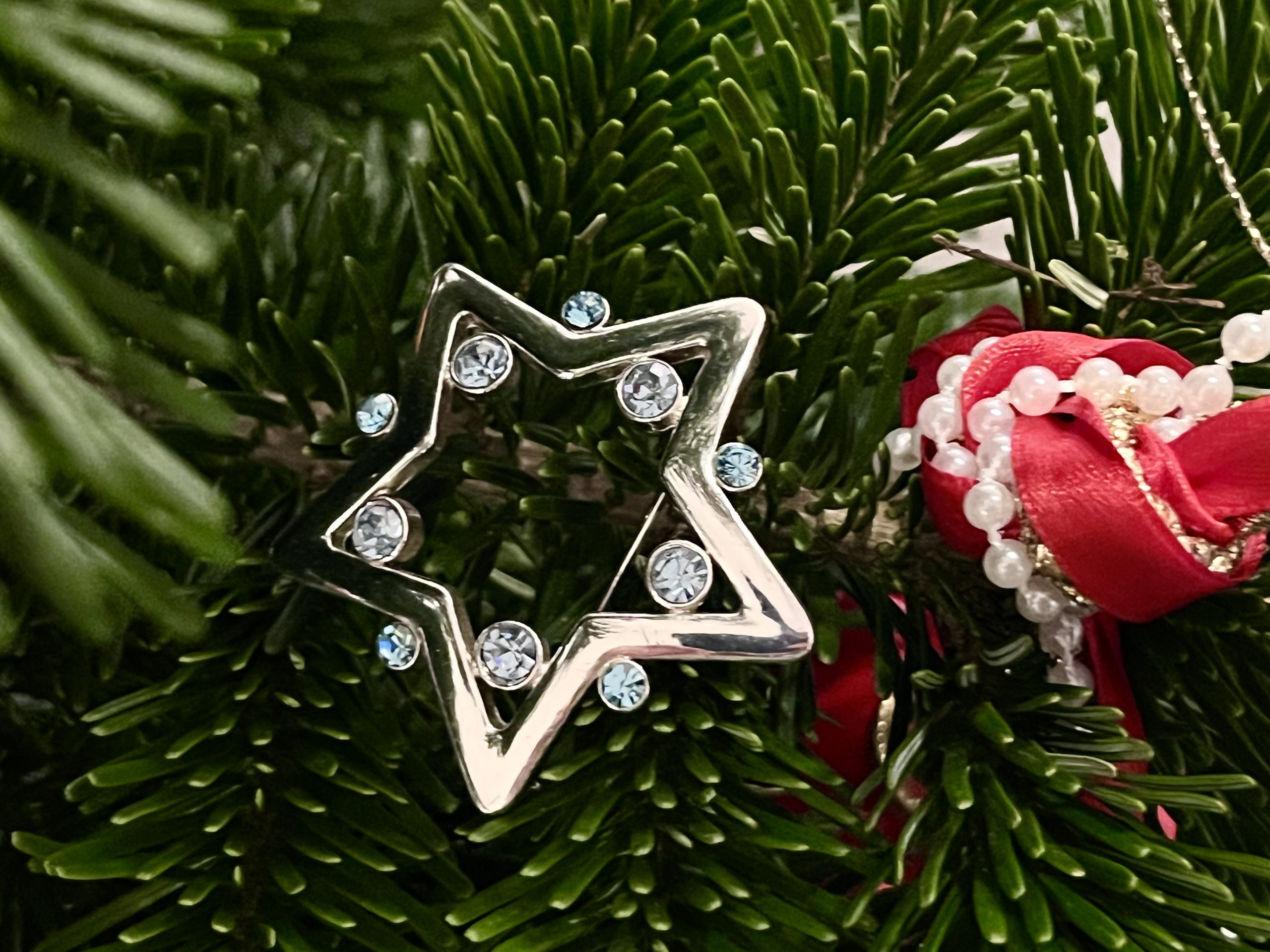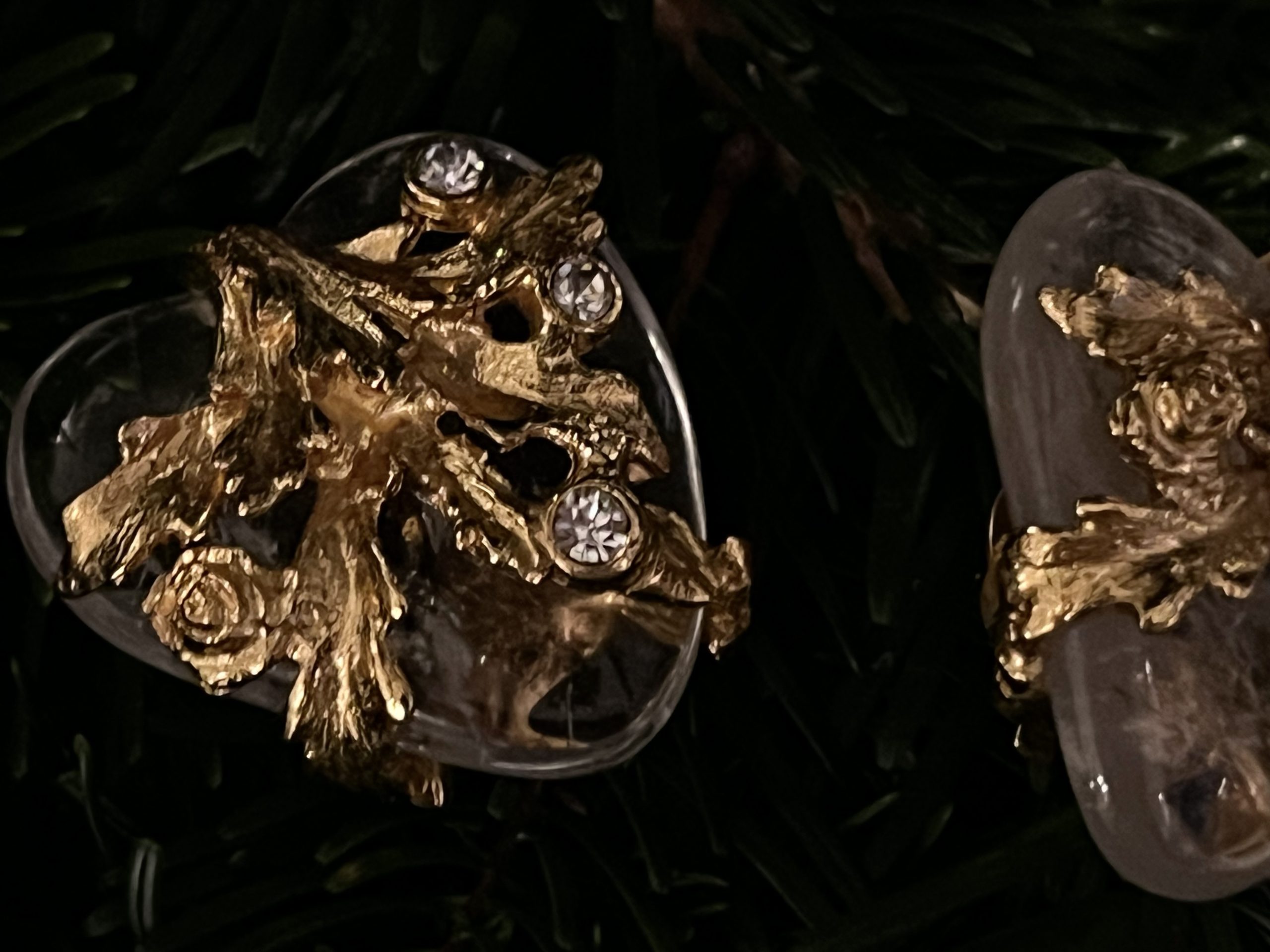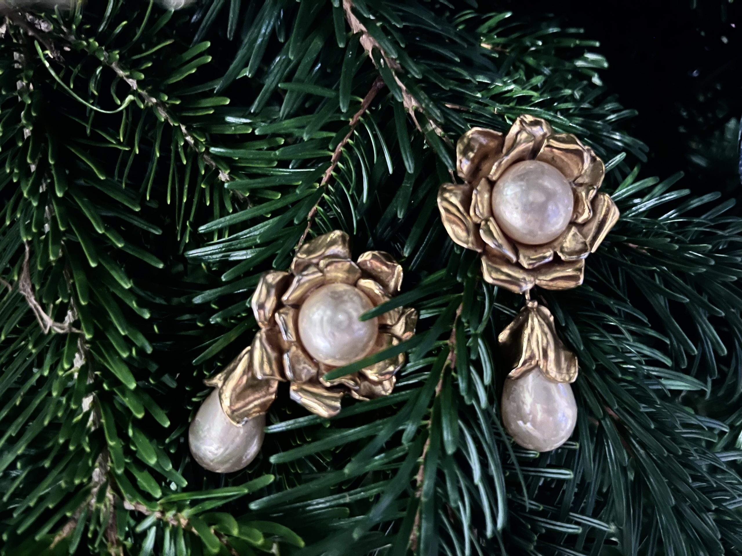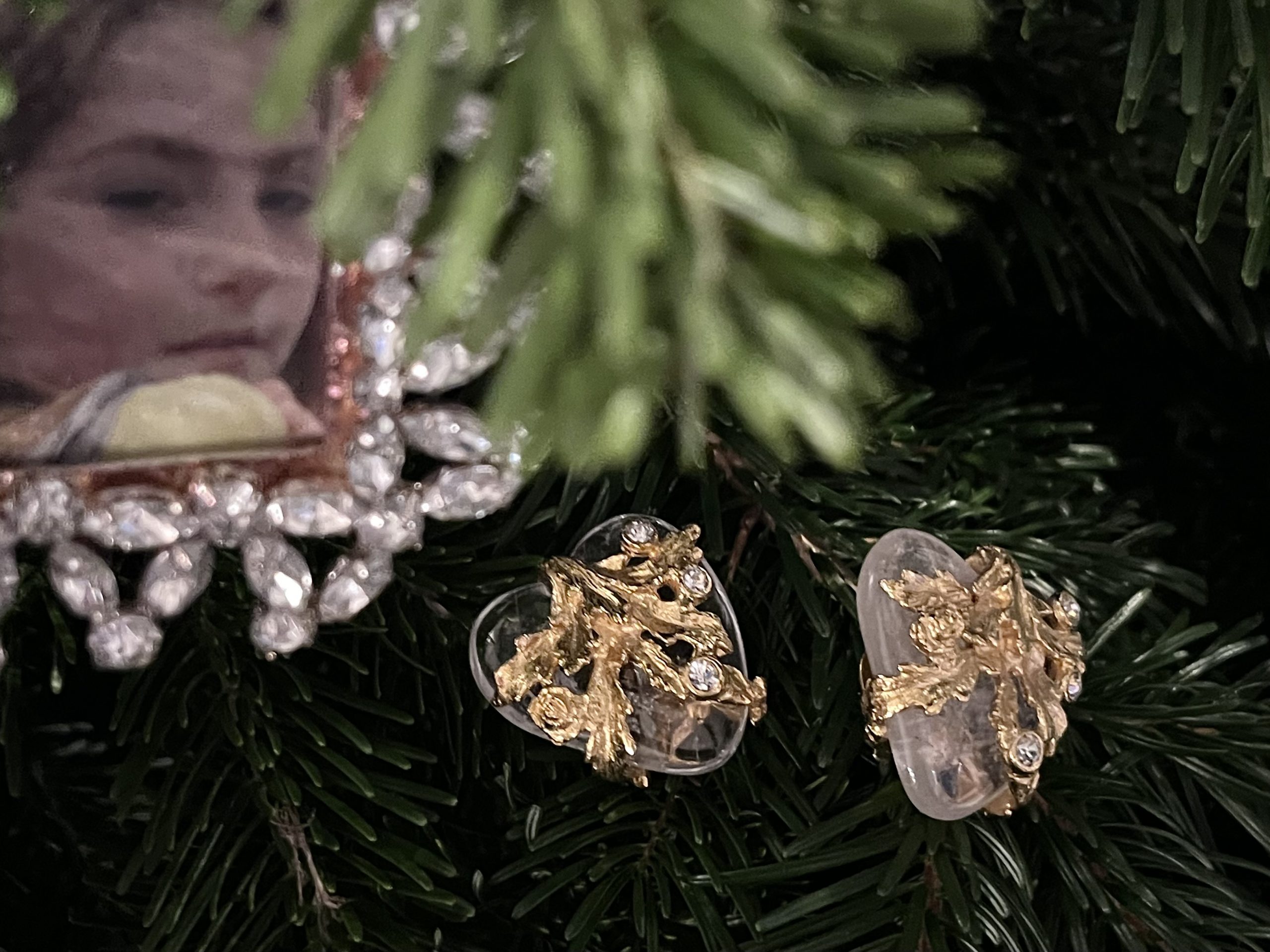 Ein paar der schönsten Schmuckstücke habe ich in den Tannenbaum gelegt: Die Herzohrclips mit Bergkristall von Yves Saint Laurent, die einst der ehemaligen Vogue Chefredakteurin Angelika Blechschmidt gehörten. Ausführt von Robert Goossens in Paris.