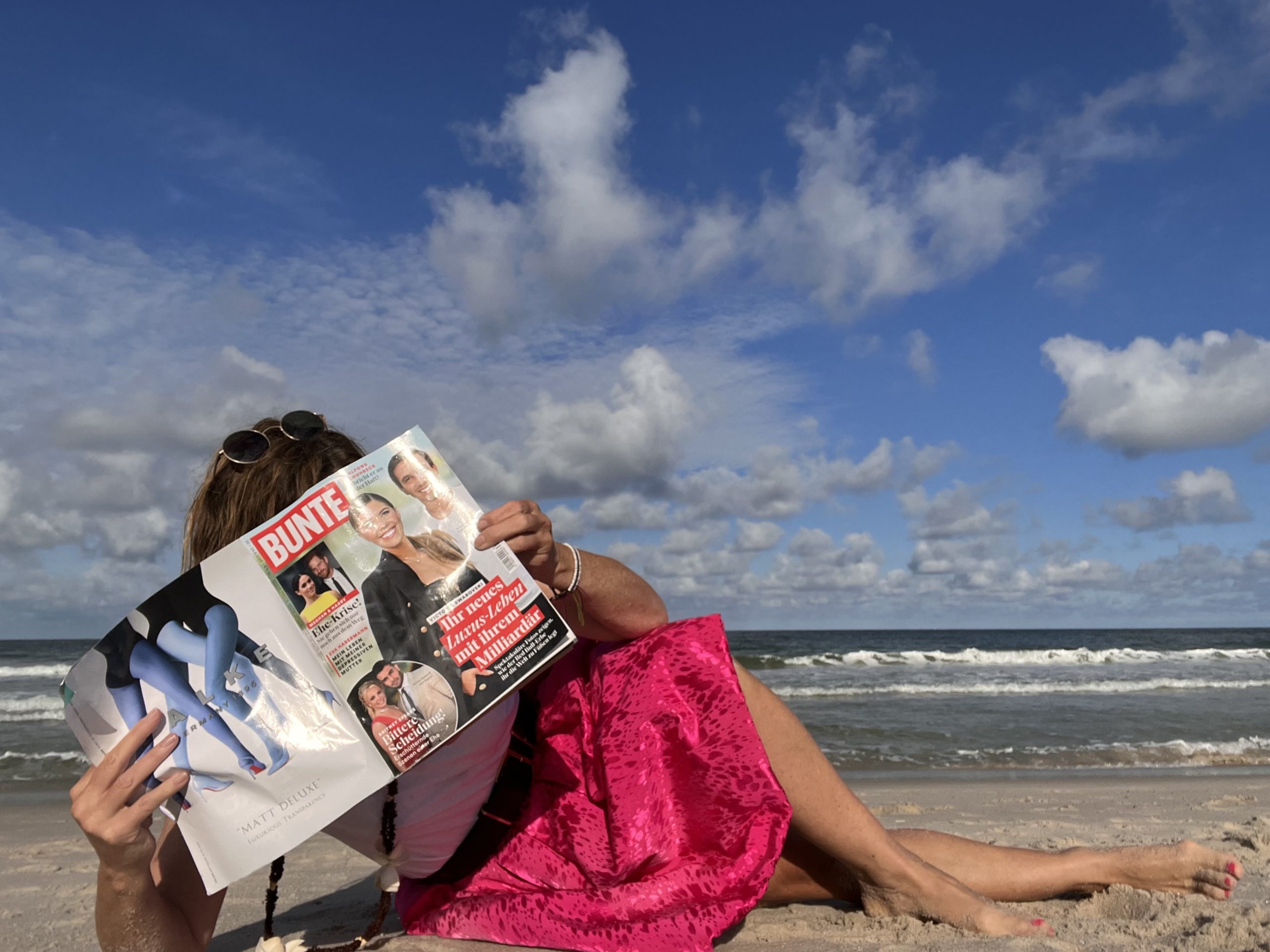 Wann sieht man mich schon mal als erstes morgens in den Dorfladen eilen, um die durckfrische Ausgabe der BUNTE zu kaufen (zusammen mit Croissants und Brötchen)? Selten bis gar nicht. Auf dem Weg zum Strand blätterte ich geschwind bis Seite 103, links die “Funkelnde Modenschau” in Salzburg, dahinter der Achtzigste von Robert de Niro, mittendrin ich in Pink Yves Saint Laurent Vintage, Arm-in-Arm mit Katrin Sachse, stellvertretende Chefredakteurin des Boulevard Magazins (4,5 Mio LeserInnen pro Woche).
