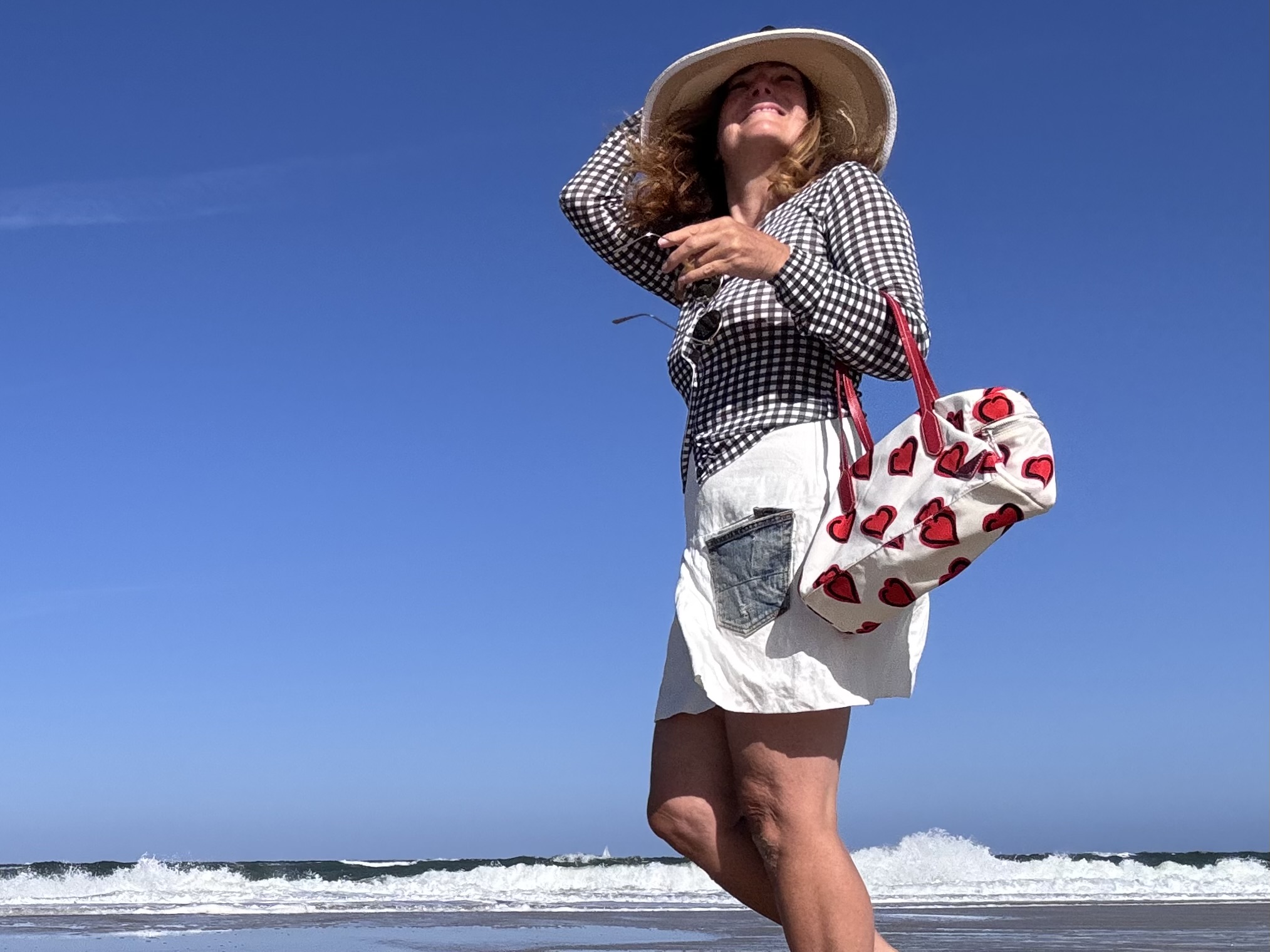 Ich hab ihn gern, weil er so unkompliziert ist, und da das Material schon geschrumpelt und geknautscht aus der Manufaktur kommt, machen ihm die paar Kofferfalten auch nichts mehr aus. Rausnehmen, reinschlüpfen und ab an den Strand oder an die Strandpromenade. Das Modell ist ein Alleskönner, wie so vieles in meiner Kollektion. Der Look hängt von den Schuhen, dem Top und der Laune ab.