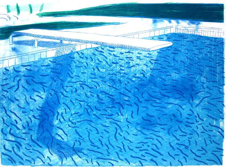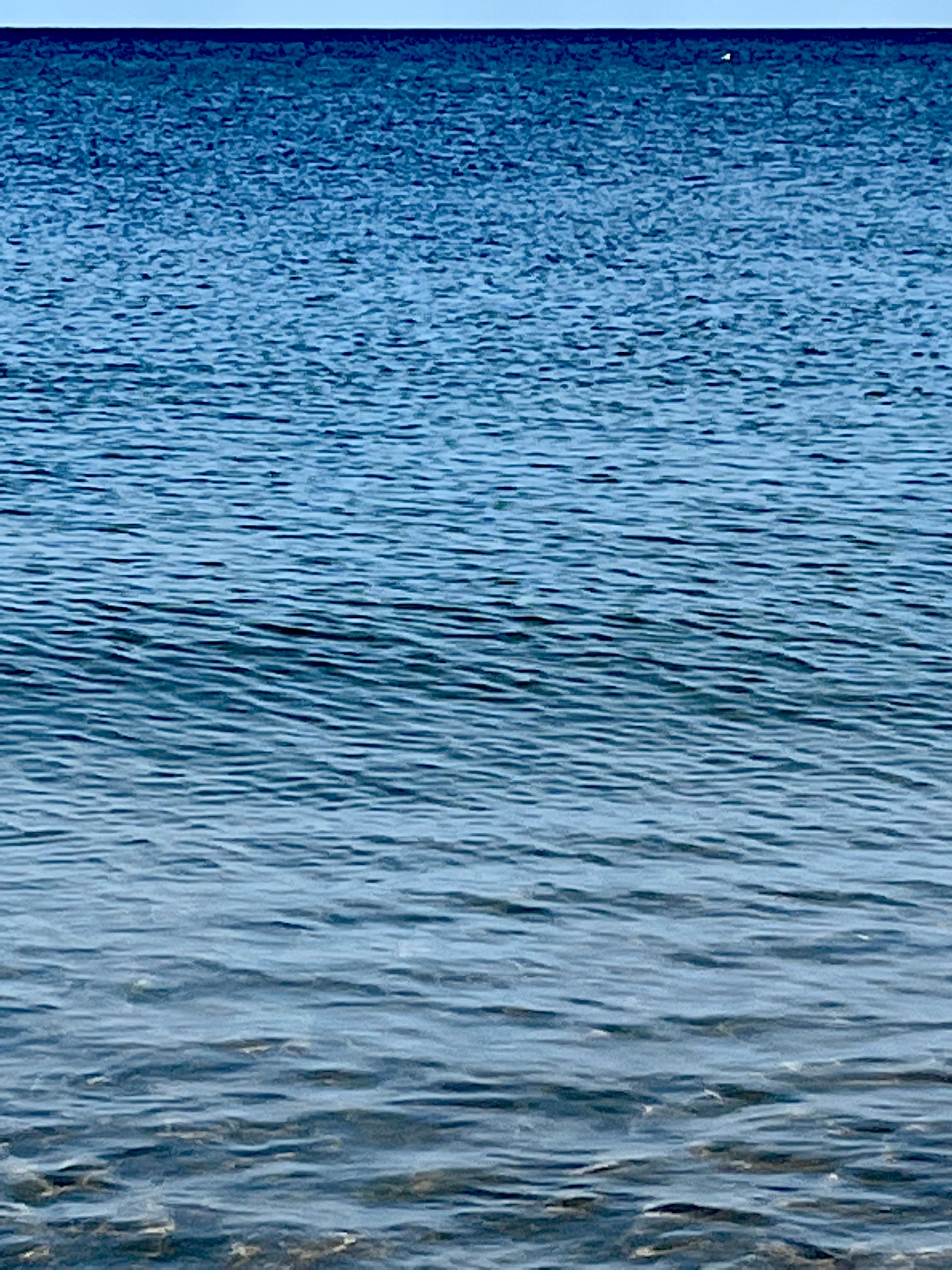 Auf die Plätze, fertig los: Wir sprechen vom Meeresblau! Vor meinen Füßen plätschert ein grün-beiges sandiges Blau, man erkennt den seichten Meeresgrund. Darauf folgt ein Swimmingpool-Blau oder Azur-Blau, das mich an David Hockney erinnert, mit seinen kleinen wellenartigen Strichen von Petrol-Blau. Ich nenne es das Fischschwarm-Blau.
