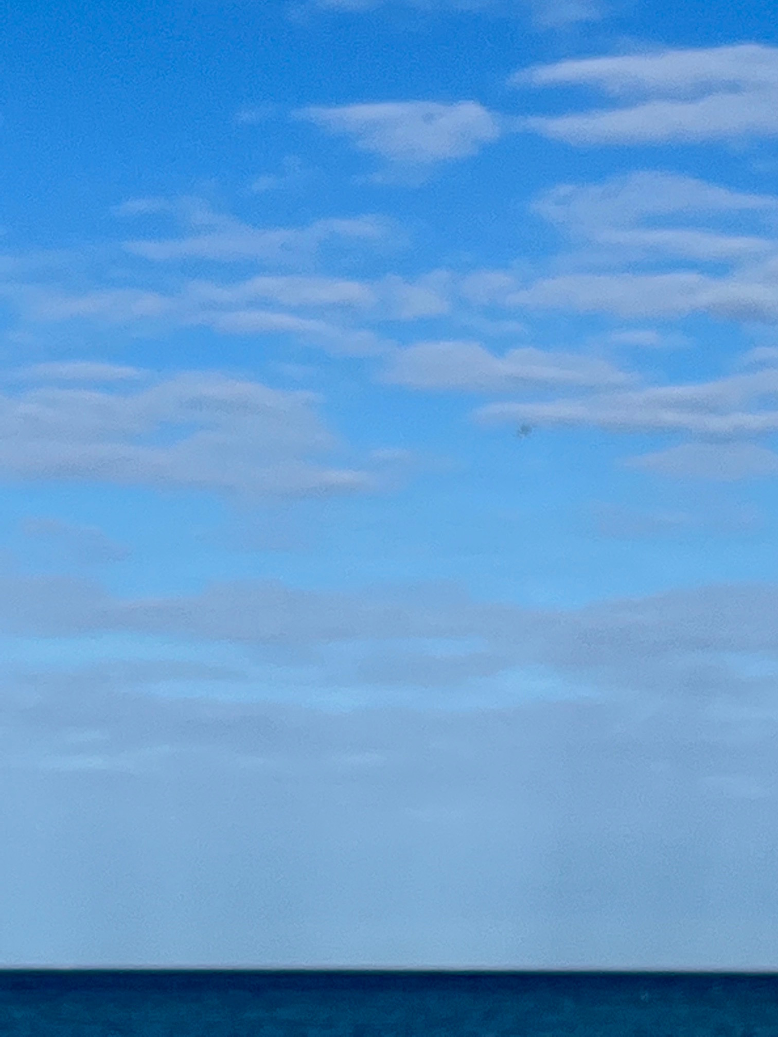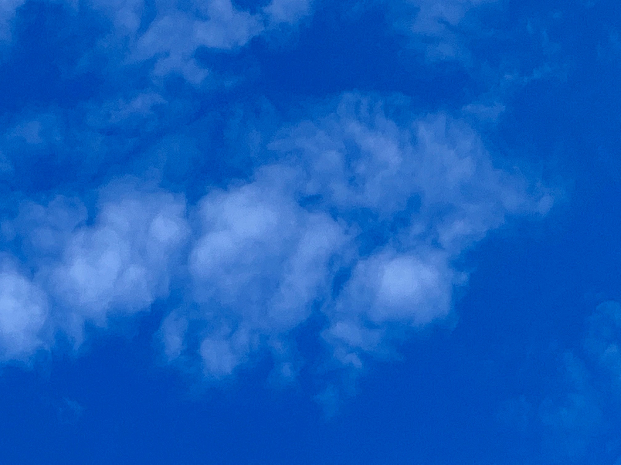 Dieses Horizont-Blau trifft mit einer scharfen Kante, als wäre die Erde eine Scheibe, auf das strahlend helle Himmelblau. Es tut nichts zur Sache, dass mir das Foto etwas unscharf gelang, ganz im Gegenteil, nun kann ich mich erst recht auf die Farbverläufe konzentrieren. Märchenhaft. Es beginnt zunächst mit einem milchigen diffusen Grau-Blau, das sich nach oben hin zu einem kühlen Baby-Blau verwandelt, durchbrochen von duftigen weiß-blauen Wölkchen.