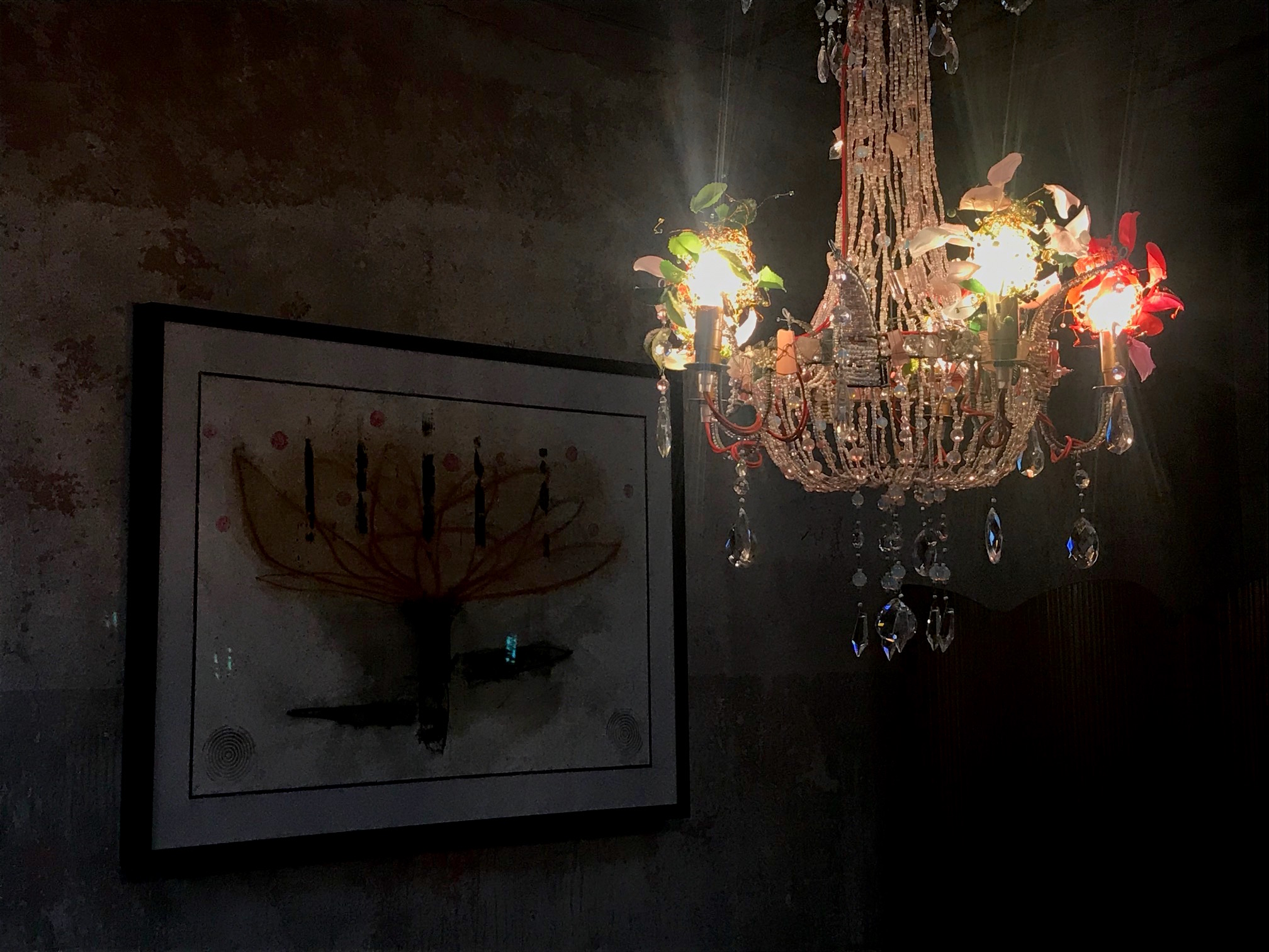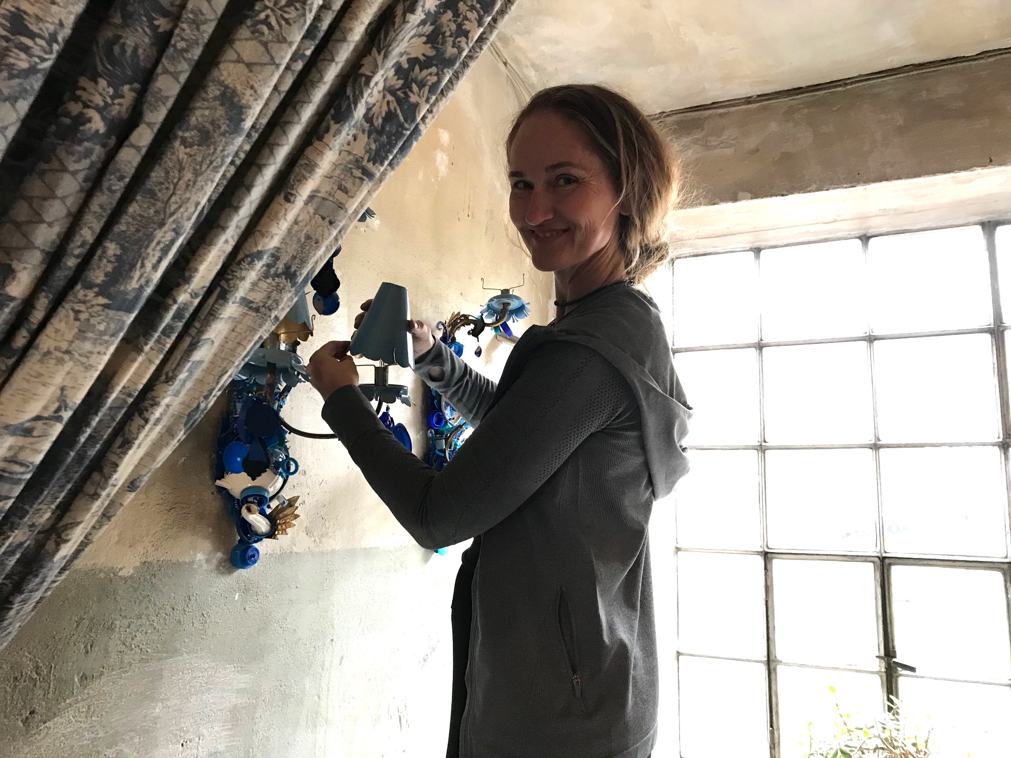 Abb: Magpie Art Collective. Unikat Wall Lichtobject. Design-Elemente, Porzellan, handgeschliffene und -bemalte Kunststoffelemente, Weißblech mit Blattgold belegt.