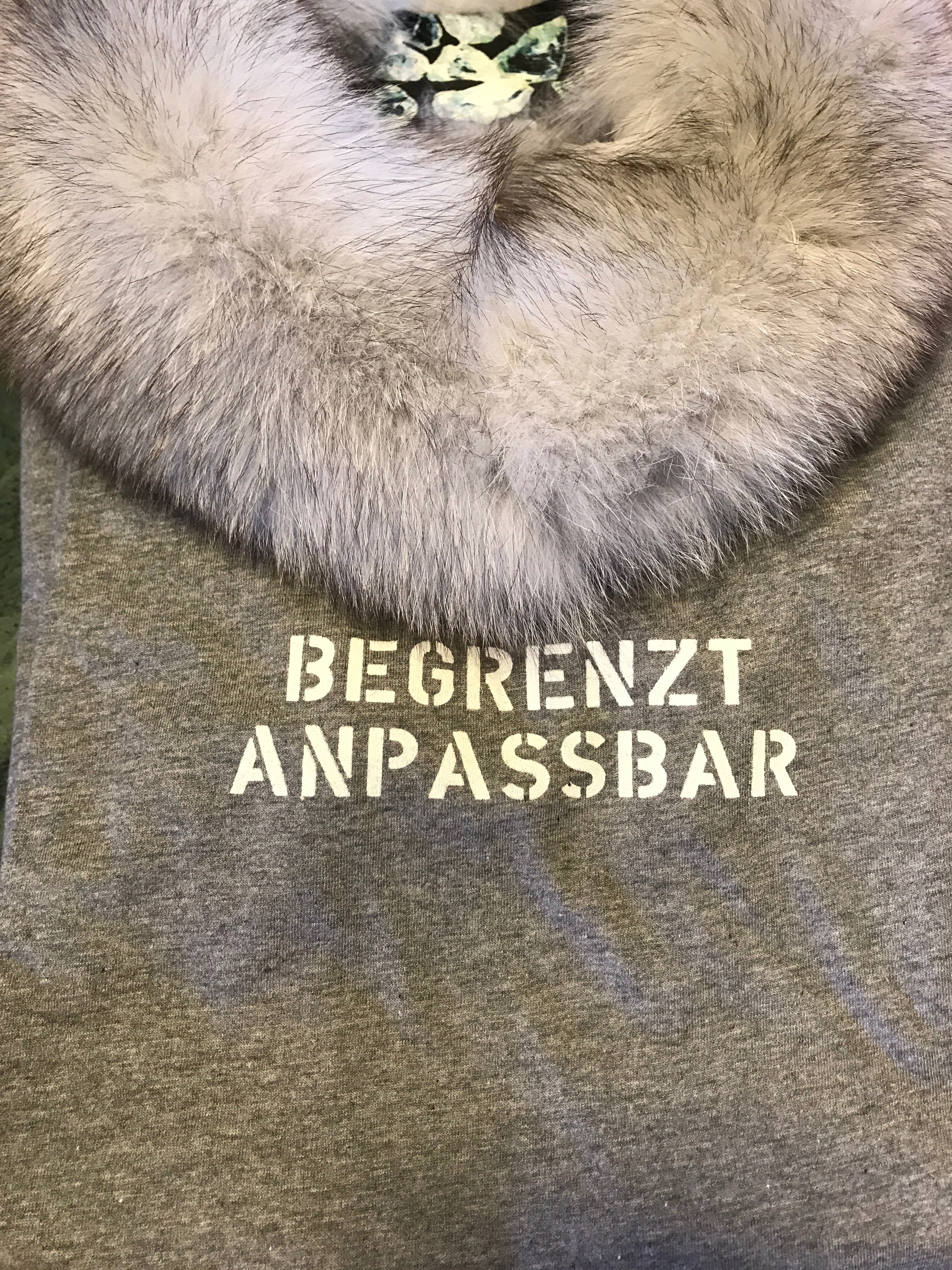 Gestern in der MILCHSTRASSE 11, es war noch relativ früh am morgen, der Laden gerade geöffnet, da schlenderte eine Frau durch die Räume: ca. Mitte 60, vielleicht auch jünger – schwer zu schätzen, weißliche Haare, Lippenstift in Koralle, lebhafte Augen. Sie würde gern ein T-Shirt probieren, eines von diesen Statement Shirts “DENKEN HILFT” oder “BEGRENZT ANPASSBAR” in grau muss es aber sein. Interessant, hätte ich für sie nie ausgewählt, ein Statement auf der Brust für diese Frau?! – Doch, doch, sie wäre sehr reduziert in allem, klar in den Formen, weiße Schrift auf grauem Grund, bitte dazu kein (schmeichelndes) Tuch …