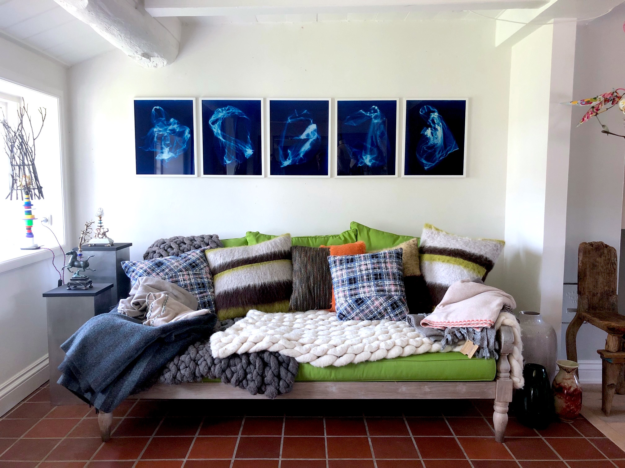 Die Cyanotypien, das experimentelle Fotodruck-Verfahren, mit der die Wassermotive auf Aquarellpapier entwickelt werden, schafft das tiefe Blau und lässt die Räume größer erscheinen. Es gelingt ein Zusammenspiel mit der davon inspirierten Kollektion: Art and Fashion im Dialog. Vernissage heute mit Drinks und Snacks: Donnerstag, den 25. Juli, 16 – 21 Uhr in der Alten Dorfstrasse 2 in Kampen auf Sylt. Freue mich auf Euch.