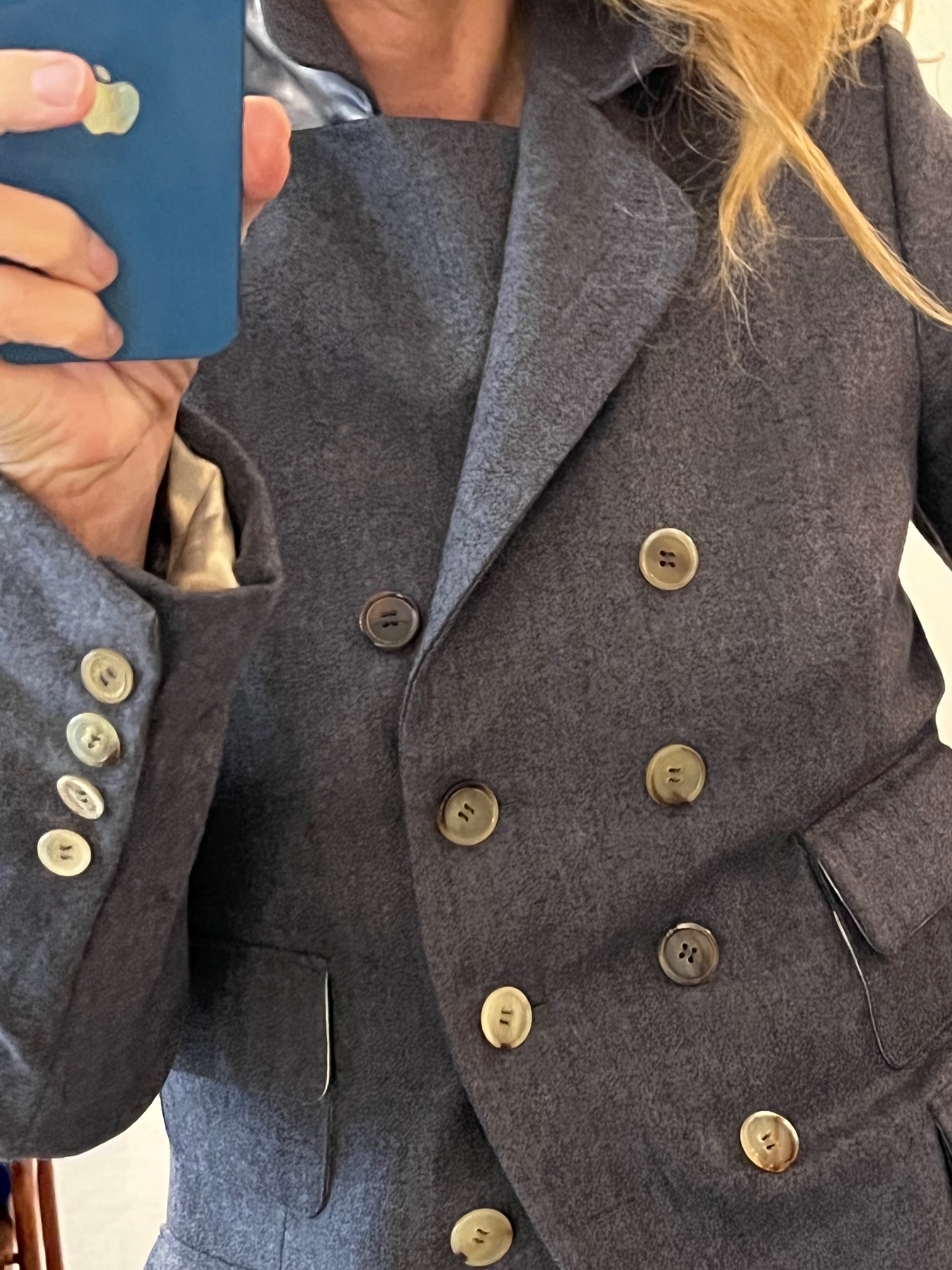 Einzelstück, Cashmere-Wolle Tweed, Himmel über Sylt Futter, Größe S (€ 650).