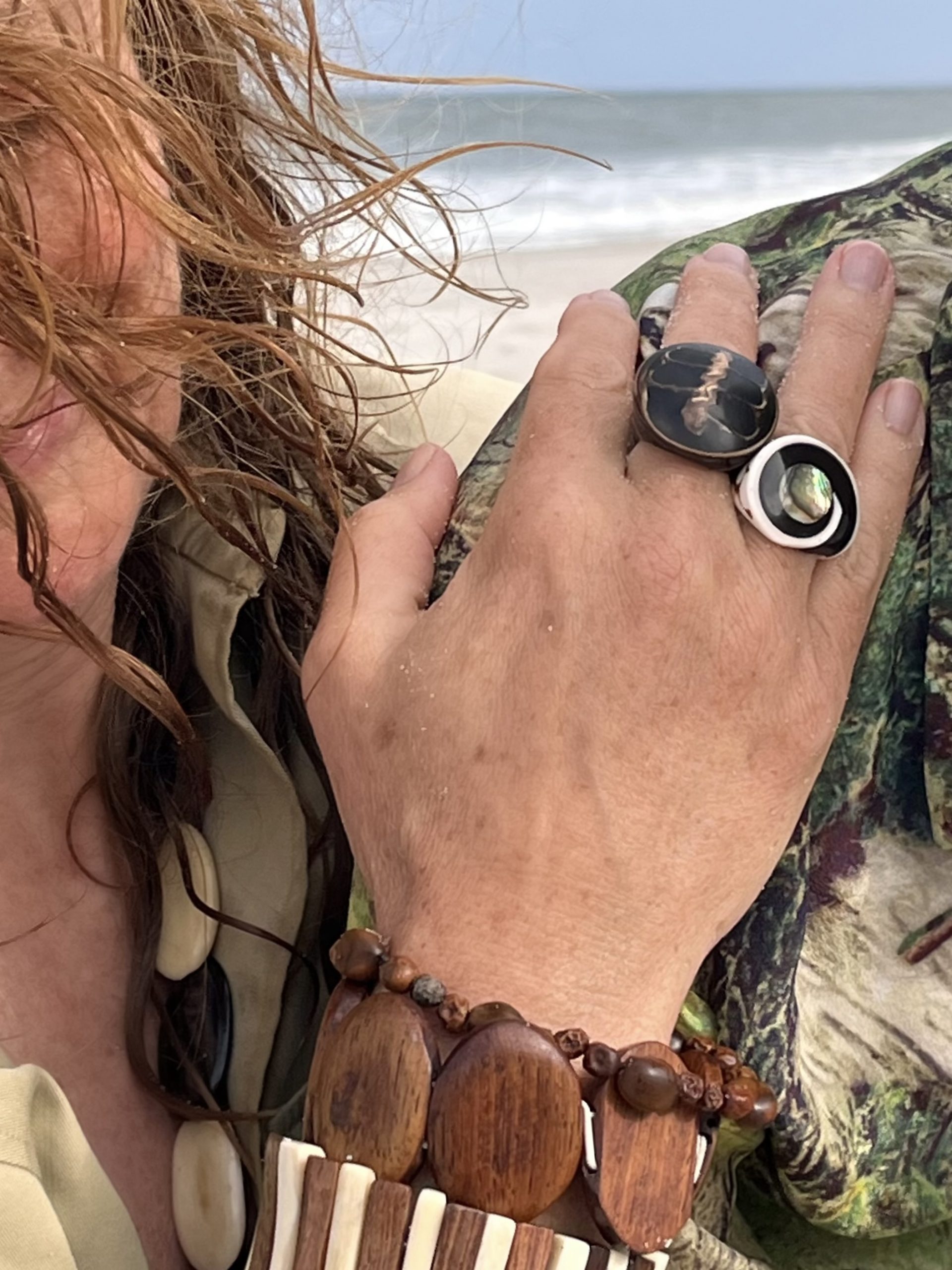 Dominika genießt die letzten Sonnenstrahlen bevor sie wieder abreisen muss. Sie trägt den Vintage Rock, ich das passende Hemd dazu. An meinen Handgelenken drängen sich die Holz- und Hornreifen, an den Fingern die Muschelringe, ganz nach meinem Lebensmotto: Too much is not enough. Sie trägt die bunt gefärbte Sebu-Horn-Kette.