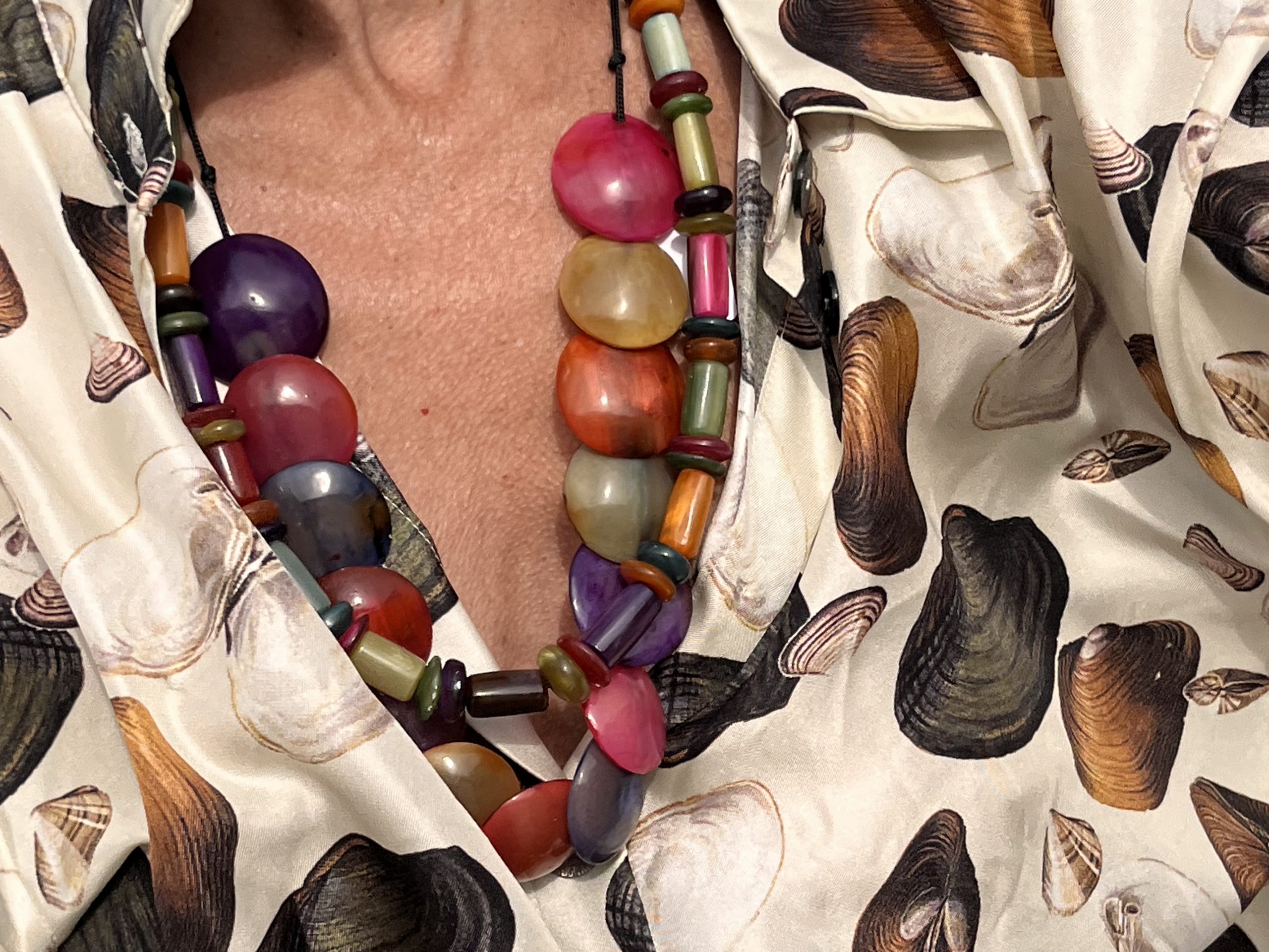Das Paket von Roma ist angekommen nach einer langen Reise von über 9.000 Kilometern. Der Inhalt: Ketten, Armbänder und Ringe aus Sebu-Horn, Holz und Muscheln, die typischen kunsthandwerklichen Erzeugnisse, wie sie auf der Réunion und den Inseln im Indischen Ozean gefertigt werden. Ich trage sie wie selbstverständlich als Schmuck zu meinen Blusen, kombiniere sie mit Vintage Yves Saint Laurent und dem Saharienne Kostüm aus den 1970er Jahren.