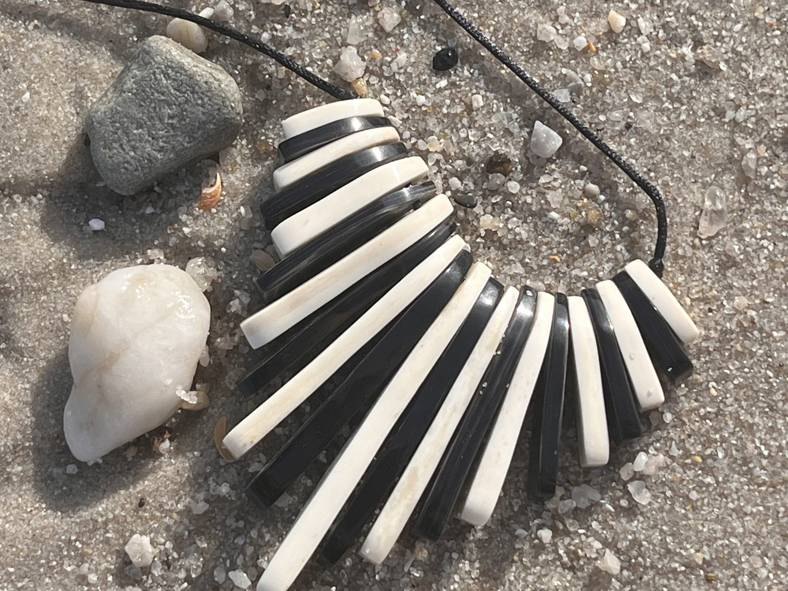 Oben: La Réunion Holz und Horn Armbänder € 120 – 160. La Réunion Kette La Réunion, Horn schwarz-weiß, € 160
