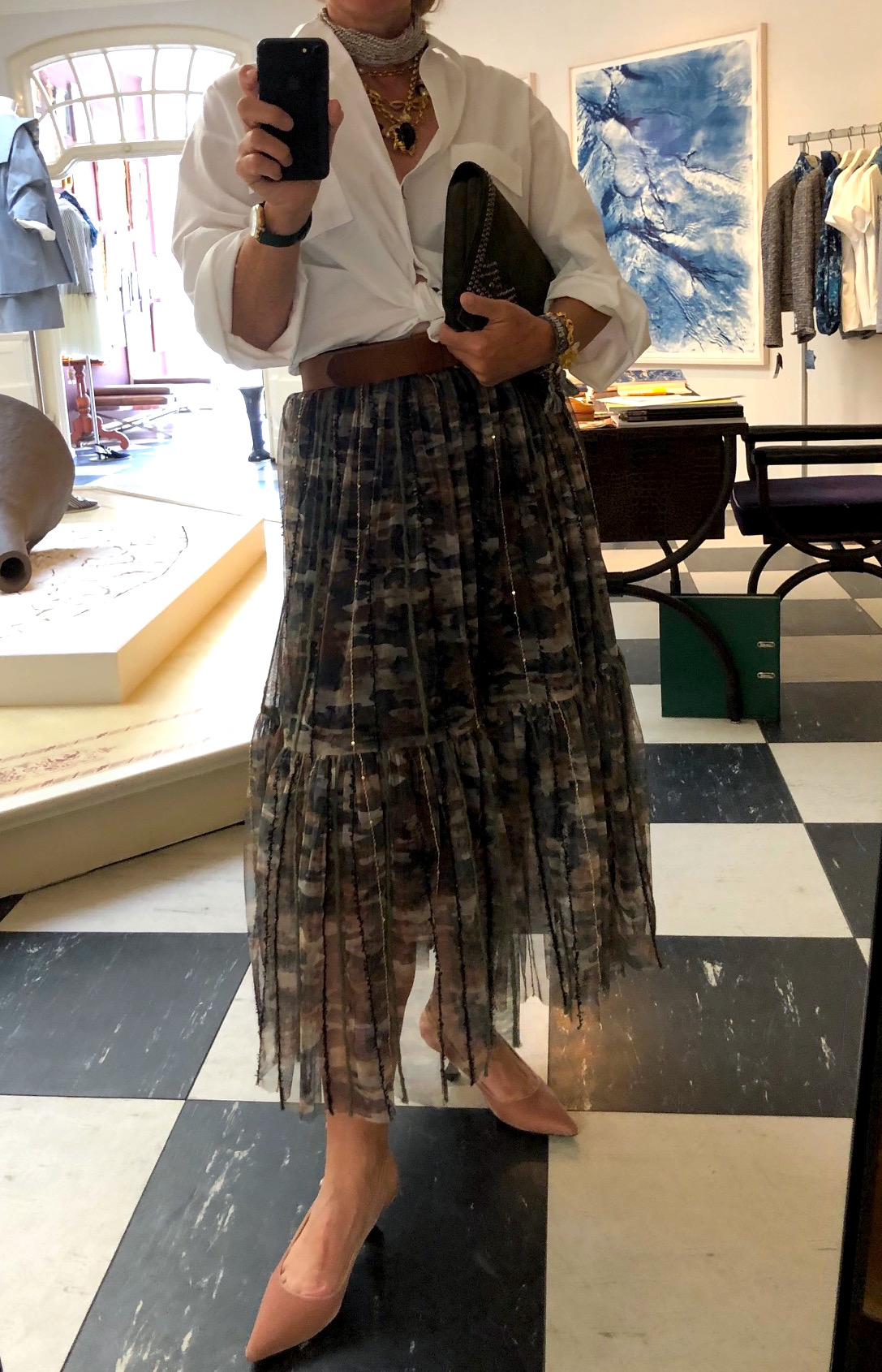 Noch schnell die Anprobe eines neuen Rockes und schwupp ist es Zeit für den Ladies Lunch von Colleen B. Rosenblat und Talbot Runhof in dem schicken In-Restaurant Die Bank. Mein Outfit: Camouflage Tütü, geknotete Kimono-Bluse, die Slingback in rosé Samt von Taglia Scarpe, Yves Saint Laurent Schmuck und Tasche, Papua Neuguinea Muschelkette.