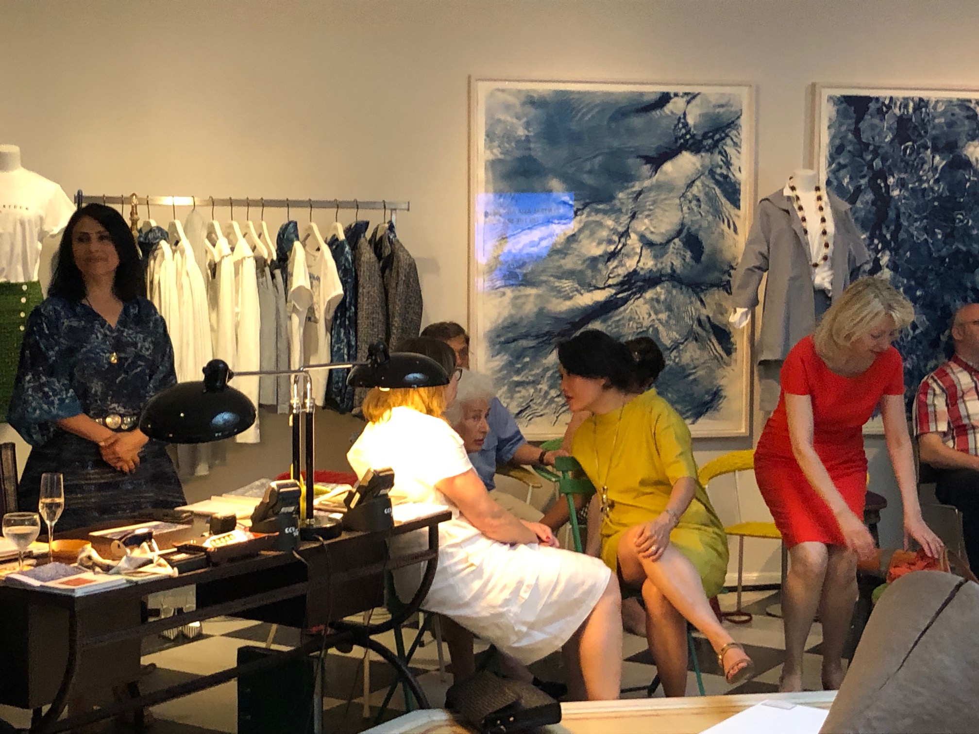 Auf’s Fahrrad und los in die Innenstadt. Die nächsten drei Stunden: kurzweilig, mit Küsschen links und rechts, kurzen und längeren angeregten Plaudereien über Literatur, Bienen, Unternehmungen, Genuss der Schmuck-Pretetiosen und einer Fashion Show, die durch fließende Stoffe und raffinierte Schnitte bestimmt ist. Eine Gegenwelt zu meiner sehr inhaltsbezogenen Mode, die mehr sein will als schmeicheln. Aber die Welt der Kreativen ist groß und hier wird ausgesprochen gutes Schneiderwerk gezeigt.