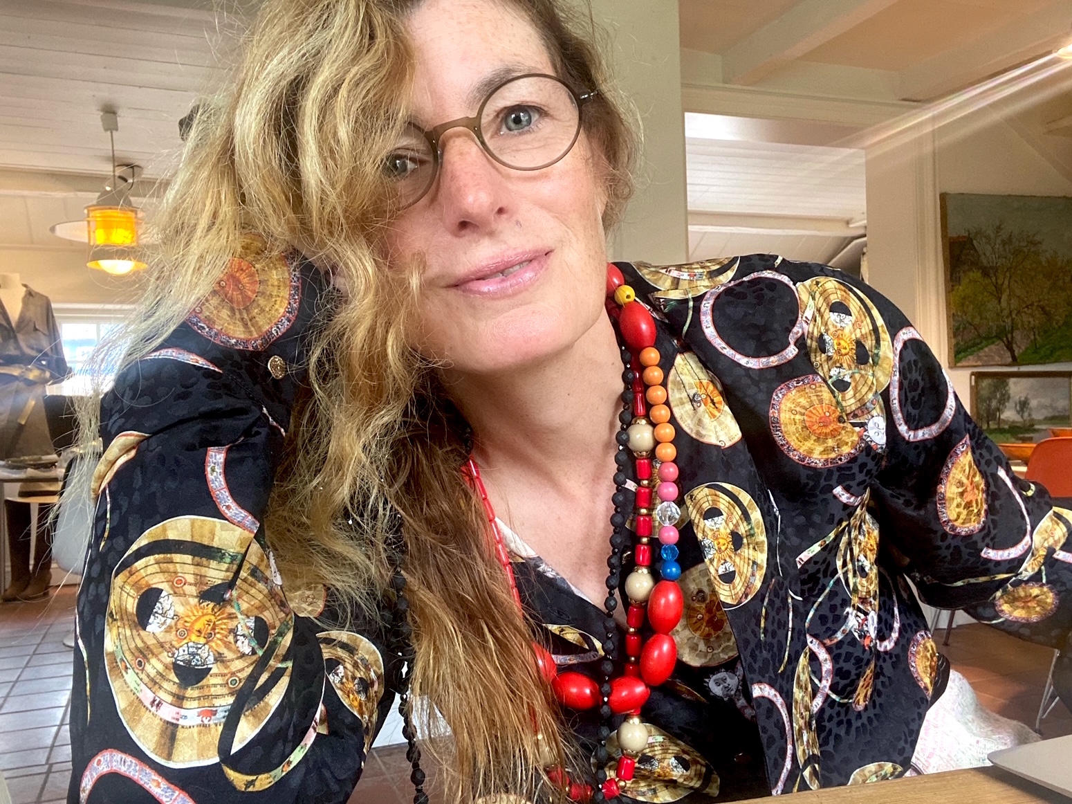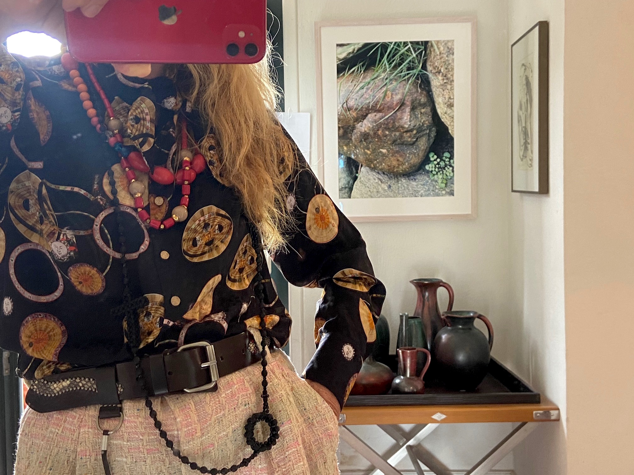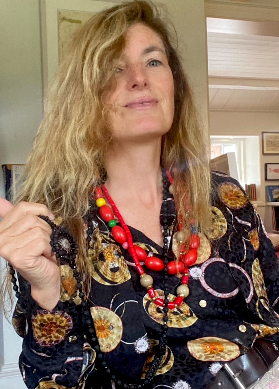 Und dazu hänge ich mir noch verschiedenste Ketten um den Hals, von Yves Saint Laurent die Rote, von der Schweizer Künstlerin Pipilotti Rist die Orangene und von der Italienerin Elena Berton die lange Schwarze mit Kreuz und Kreis (€ 340).