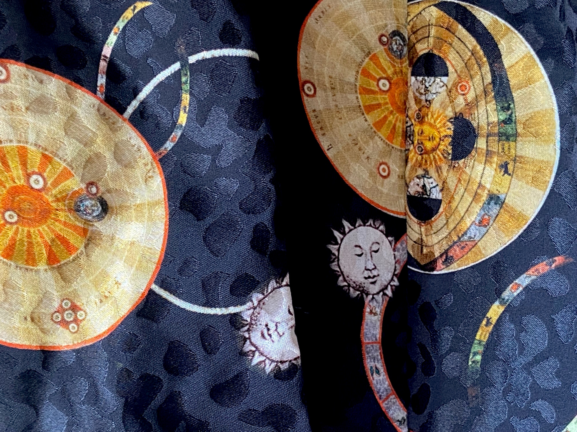 Endlich geht es mal wieder um Fashion, um ein Lieblingsstück, um einen besonderen Stoff und ein außergewöhnliches Dessin: die Kopernikus Bluse in schwarz. Meine Tochter Toska (24) und ich haben das Grundmaterial ausgesucht, ein Seiden-Satin Jacquard mit glänzenden amorphen Feldern. Dazu der Druck des Helizontrischen Weltbildes von Kopernikus, allerdings von mir noch zerlegt und von unserem Stoffdrucker zu einem endlos Rapport komponiert.