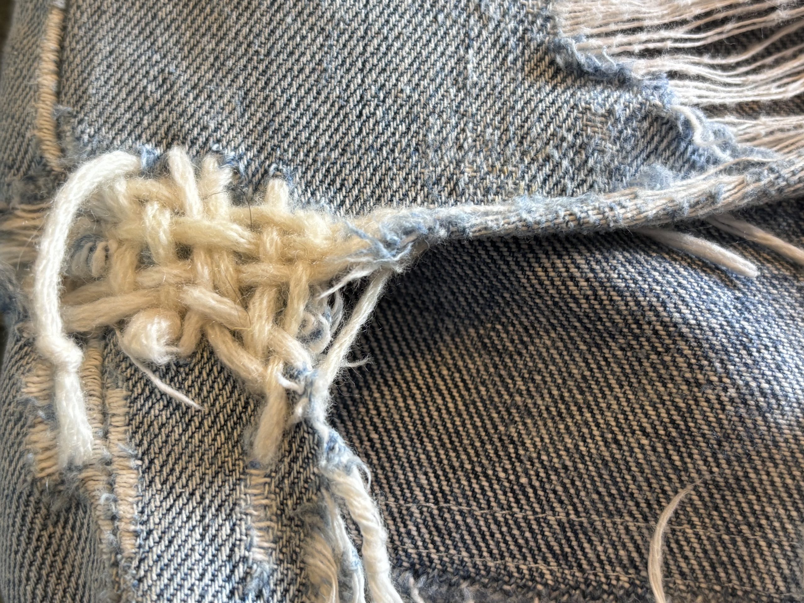 Als erstes “Opfer” ist meine heißgeliebte kurze Jeans dran. Sie zeigt mehr Löcher und Bein, als altersgemäß akzeptabel ist. Also versuche ich mich als erstes mit Freestyle-Stichen und einem kreativen Geflecht von drunter-und-drüber.