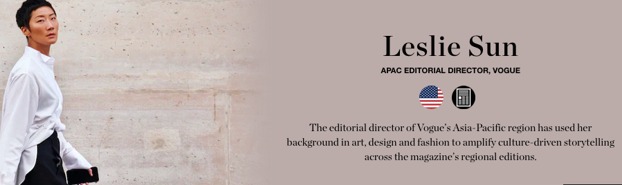2019 wurde Leslie Sun Chefredakteurin der Vogue Taiwan. Mit der Umstrukturierung von Condé Nast erweiterte sich 2021 ihr Aufgabenbereich zum Editorial Director der Vogue Asia-Pazific Region, in dem ungefähr ein Viertel unserer Gesamtbevölkerung lebt, mit den Ausgaben India, Japan und Taiwan.