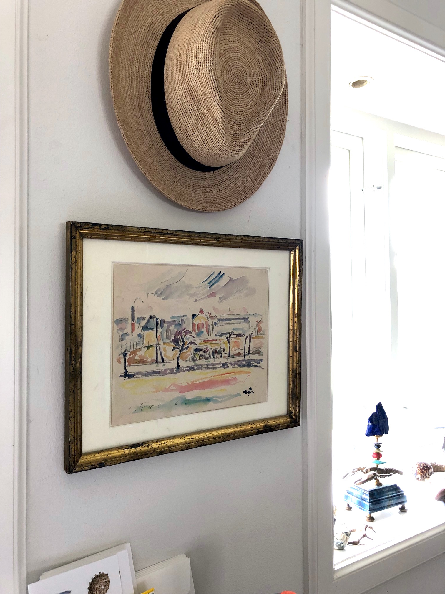 Rechts oberhalb des Schreibtisches neben dem Fenster hängt ein kleines Aquarell von Ivo Hauptmann (1886 – 1973), “Uferstrasse bei Löschwitz bei Dresden”, um 1925. Darüber der Sonnenhut. Hinter mir das Waterscape Bild von Ulf Saupe, genauso wie zu meiner linken, ein wenig versteckt hinter dem Holzständer des alten Kapitänshauses.