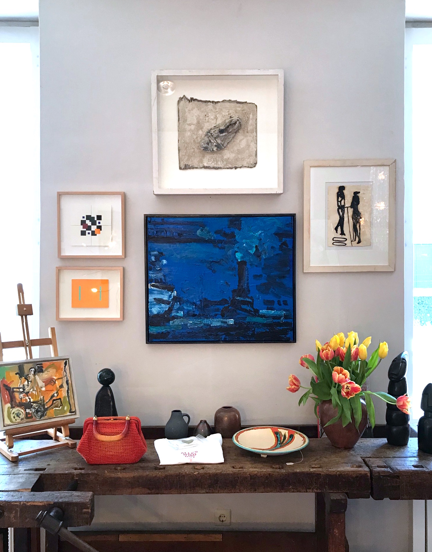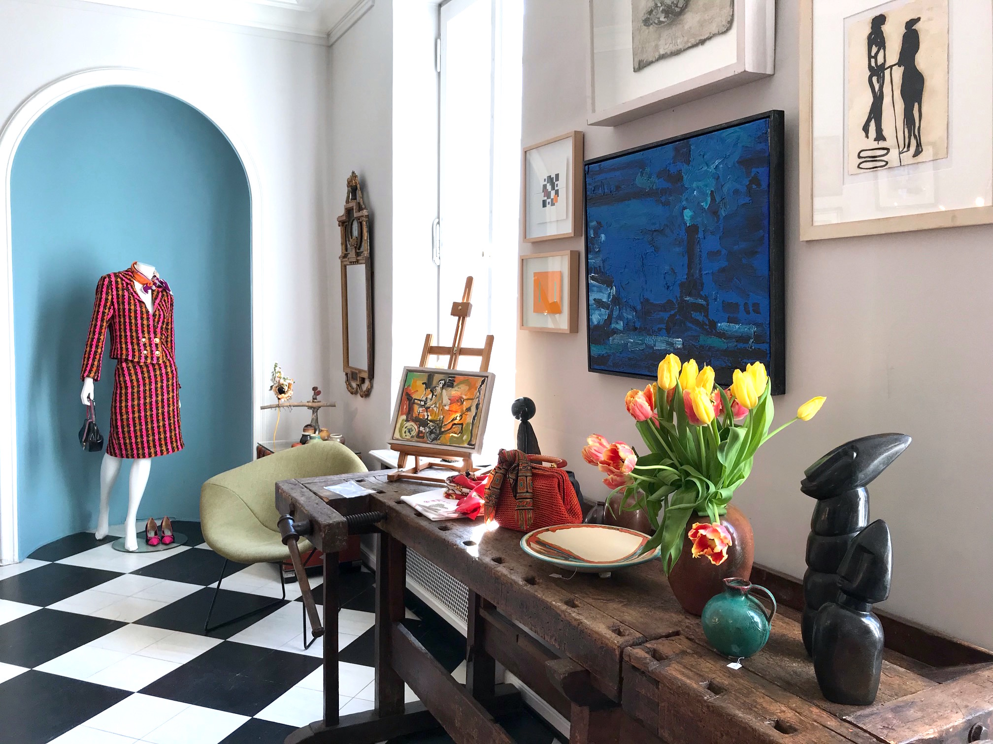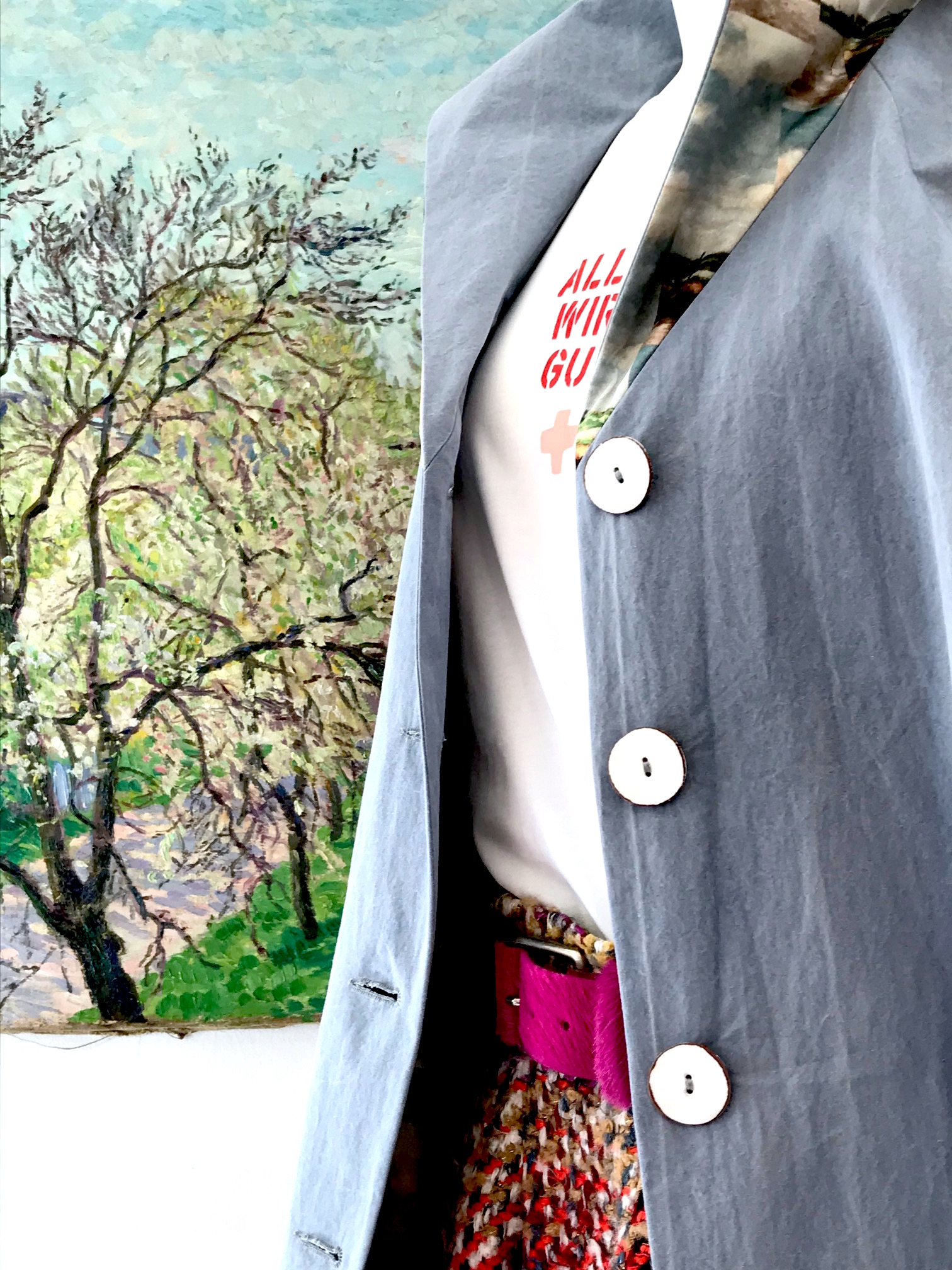 Endlich bin ich aus meiner kontemplativen In-der-Ecke-hocken herausgekommen, habe alles neu gehängt und arrangiert und heute geht es damit weiter. Es sind ganz neue Liaisons entstanden und der “Chambre d’Amis” wurde mit einer lebhaften Zwischensprache zwischen Kunst und Mode erfüllt.