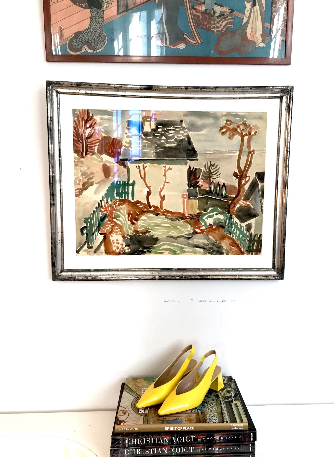 Es entstehen neue Kontexte und Farben finden andere Farben, unterstützen sich, auch wenn sie als Objekte nichts miteinander zu tun haben. Das saftige Gelb der Schuhe von Taglia Scarpe spricht mit dem grünen Zaun aus dem Aquarell von Wilhelm Grimm. Ähnlich wie der “Frühling” von Ernst Eitner mit dem blauen Mantel von Roma e Toska.