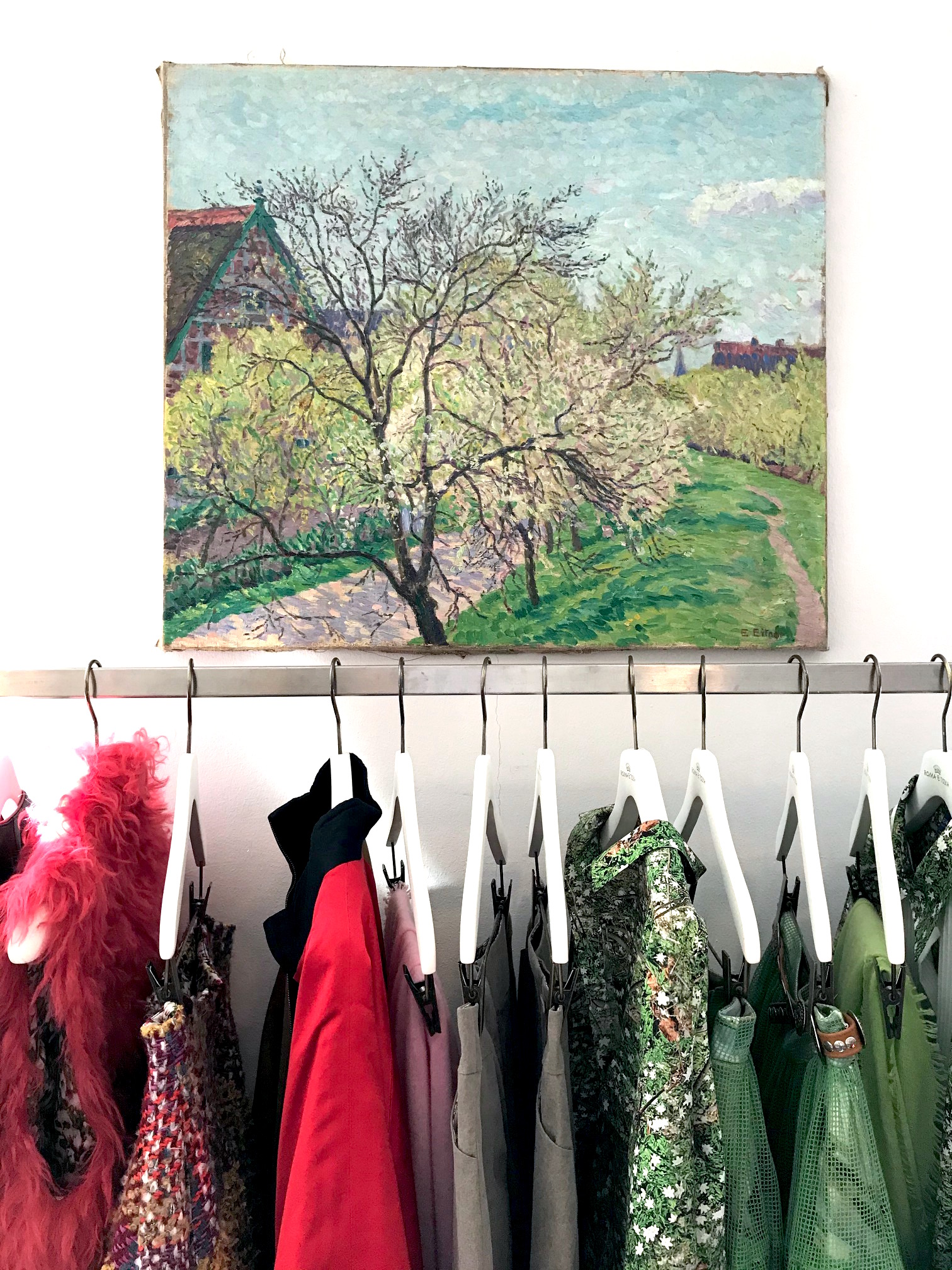 Abb.: Ernst Eitner (1867 – 1955). Frühling am Deich, 1910, Öl auf Leinwand,70 x 80 cm. Roma e Toska Mantel (€ 798), Shirt (€89 inkl. Maske), Fellgürtel pink (€198), Faltenrock Bouclé (€ 598)