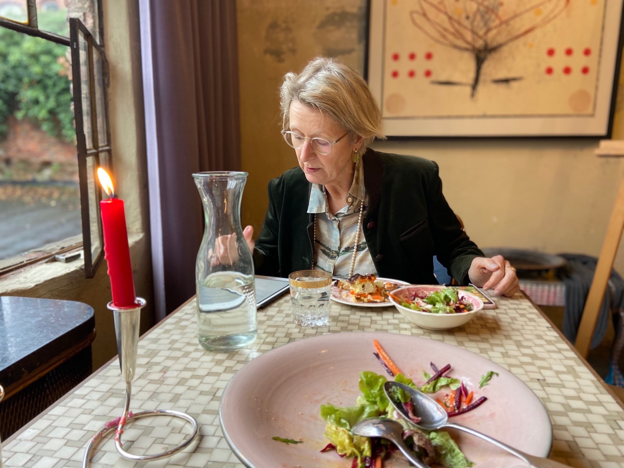 Wir haben es angekündigt, dieses Mal geht es beim Lunch am Montag um die klassische Kunstgeschichte mit einem wahren Meisterwerk. Fast überflüssig zu erwähnen, wer mit mir speist, aus besonderem Anlass mit vollem Titel: Dr. habil. Karen Michels. Und ich krame ebenfalls meinen Doktor phil. raus, damit wir zeigen, dass wir so engagiert über viele Semester studiert haben. Der Ort wie zuvor: der Tempel von 1844 in der Poolstrasse 12, das Essen von Hej Papa, unseren Nachbarn von gegenüber.