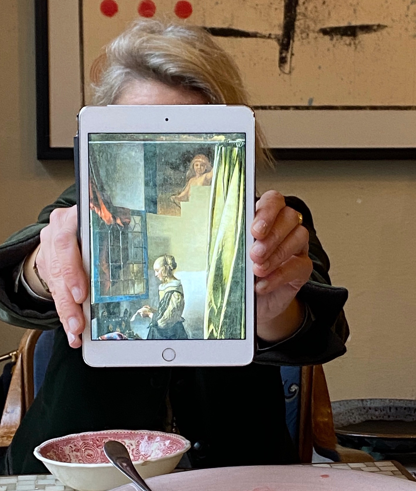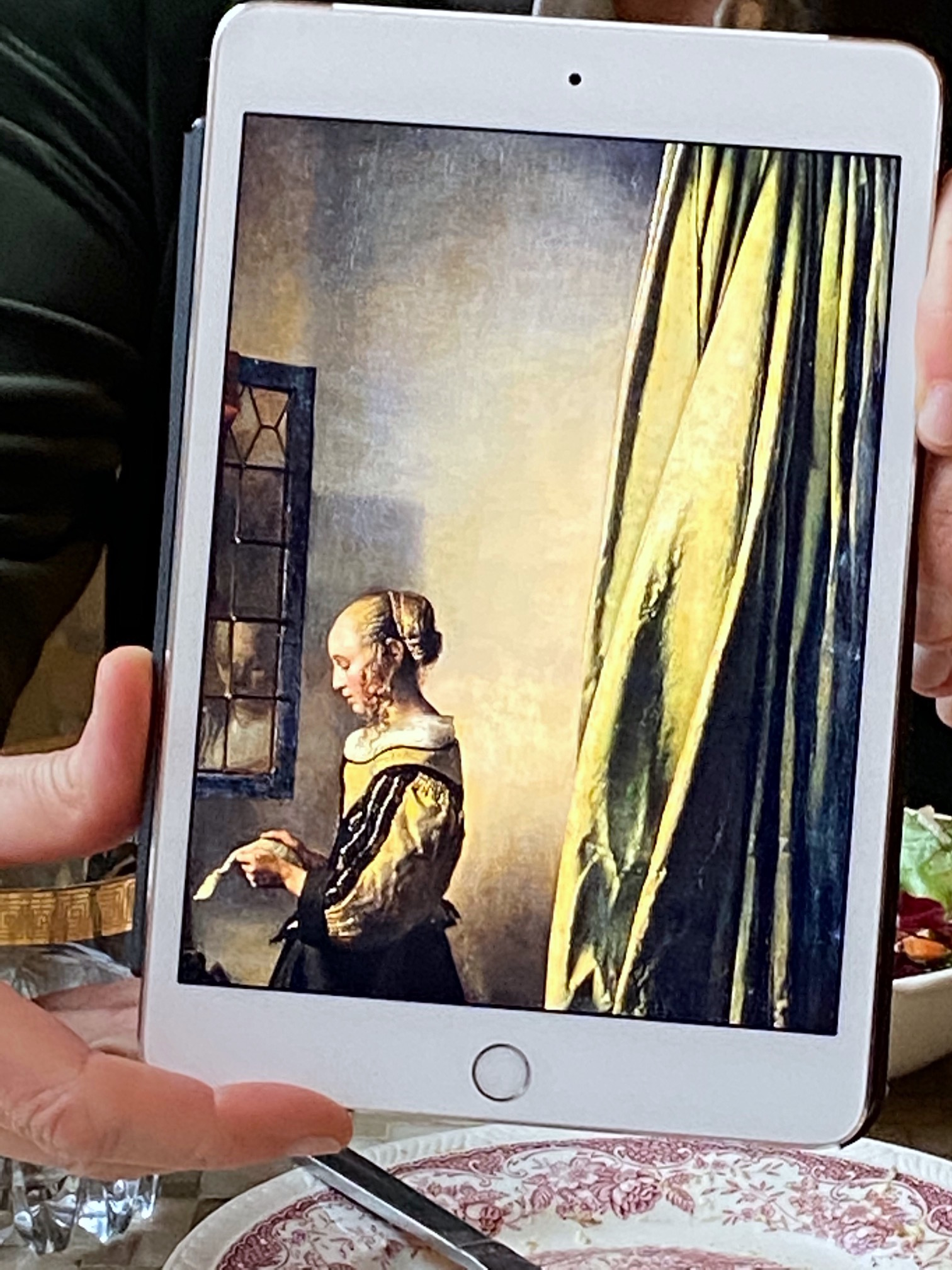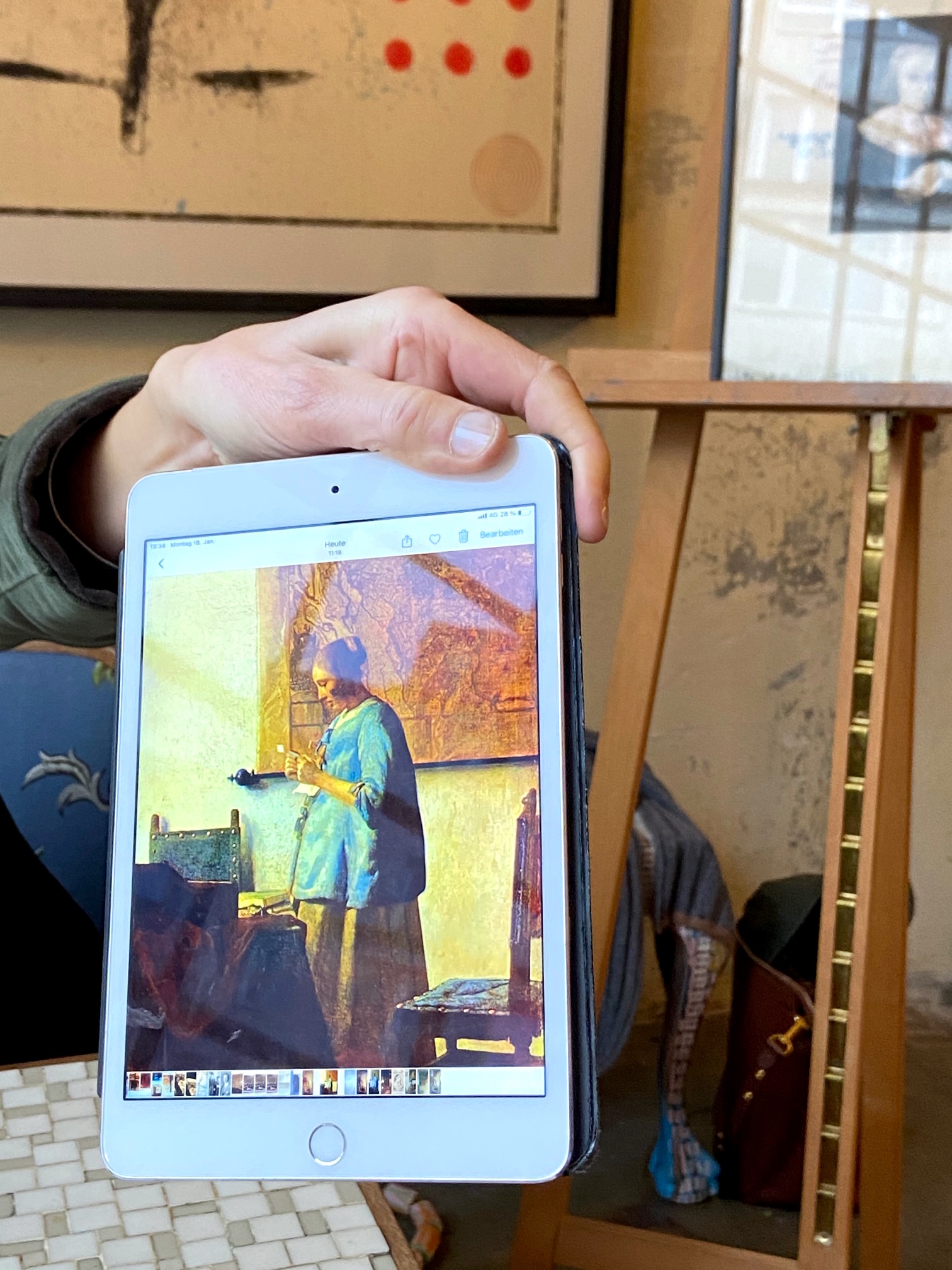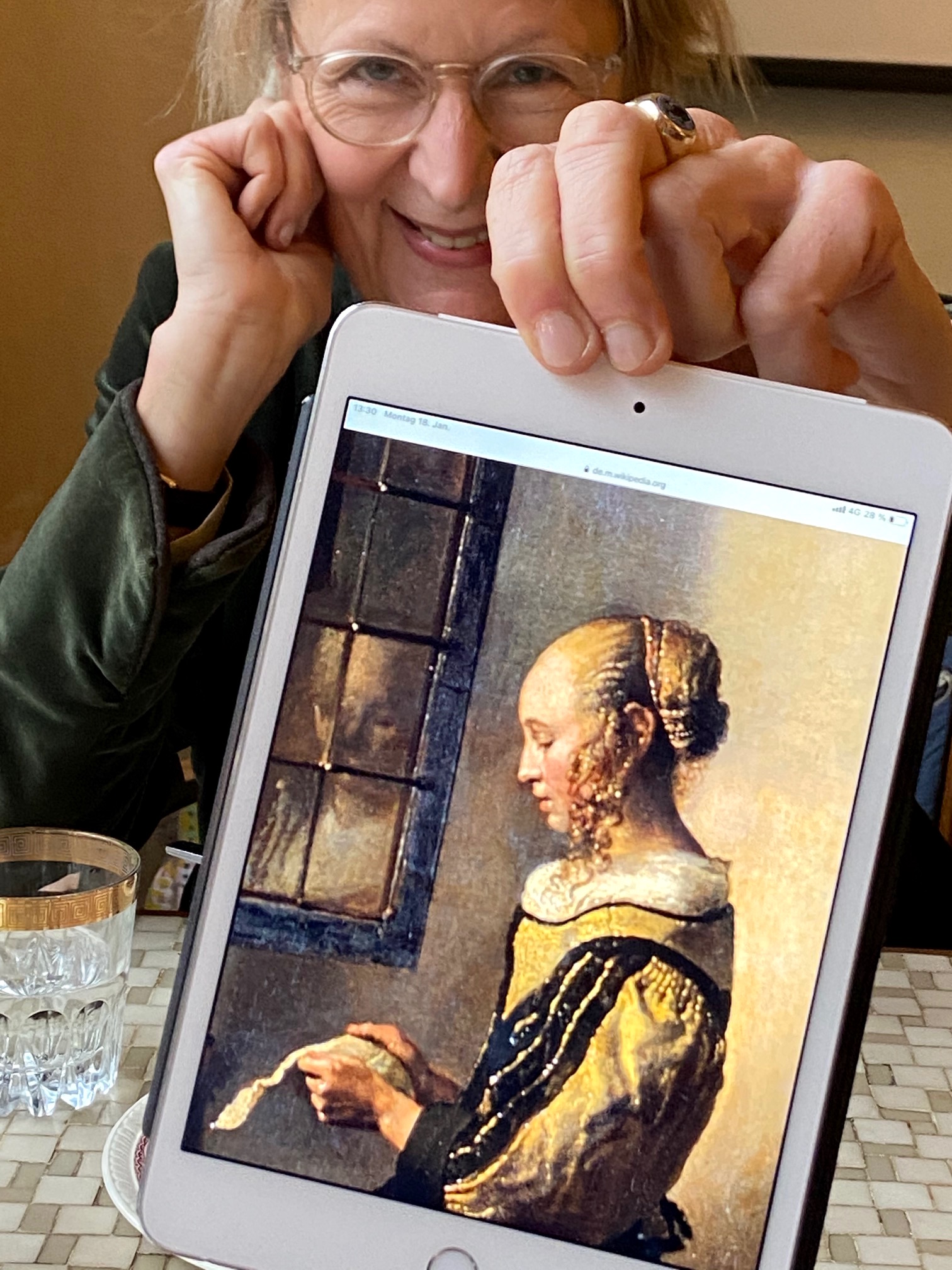 Knapp 100 Jahre nach seiner Entstehung kam das Bild 1746 nach Dresden, gekauft hatte es August der III., der ein wenig Nachholbedarf hatte gegenüber seinen Königskollegen in Europa. Dort hängt es noch immer in der Galerie Alter Meister. (Eine große Vermeer Ausstellung ist vom 4.6.2021 – 12.9.2021 geplant, wenn es denn so bleibt. Auf jeden Fall sind wir top-aktuell! Und auch der Dress-Code stimmt.)