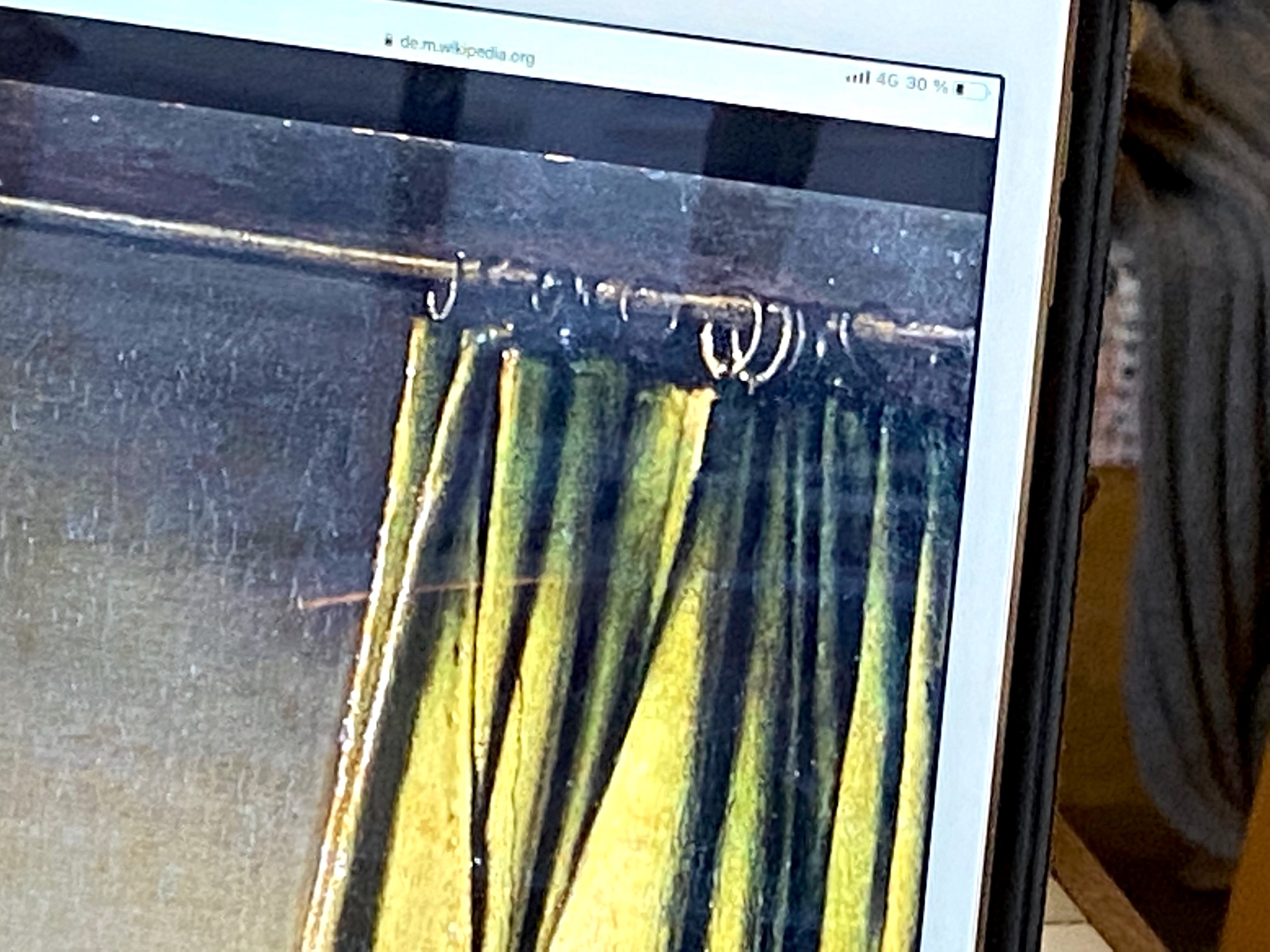 Soweit die Eckpunkte, die der Beschreibung vorangestellt werden. Nun arbeiten wir uns wie Detektive durch das Werk von Vordergrund zu Mittelgrund und Hintergrund, ganz wie im ersten und zweiten Semester. Karen wird sofort euphorisch, könnte “sterben” für die so einzigartig gemalte Gardinenstange mit dem Vorhang. Er öffnet den Blick in das Zimmer und versperrt ihn zugleich. “Repoussoir” nennt man es, ein Zurückschubsen des Betrachters, nur um gleich drauf den Raum noch tiefer erscheinen zu lassen.