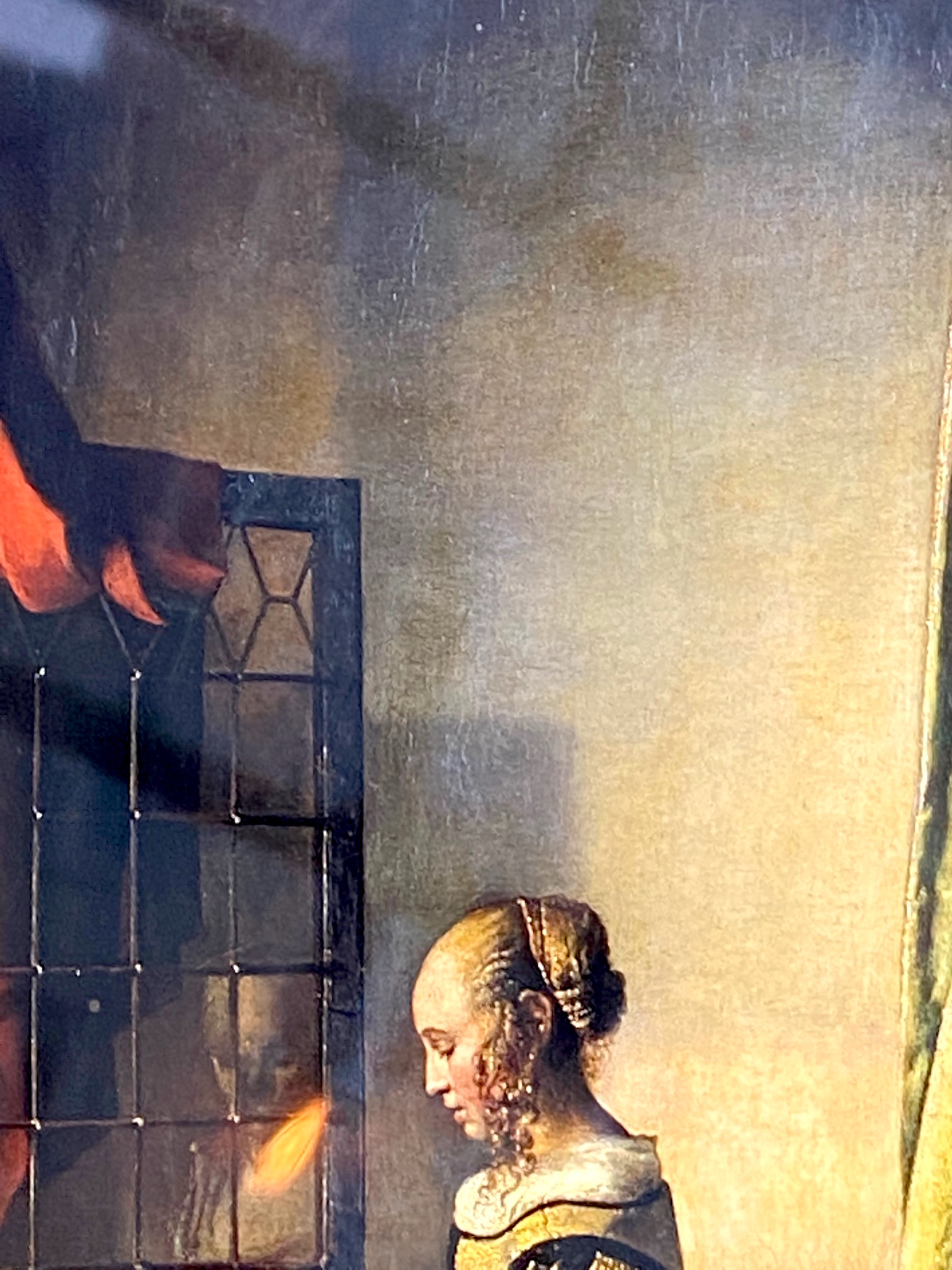 Spannung ist angesagt, denn die Dame, die dort im Mittelgrund den Brief liest, ist vielleicht gar nicht so unschuldig, wie man auf den ersten Blick vermuten könnte. Ihre Haare sind streng nach hinten geknotet, aber ein paar Strähnen hängen nachlässig zu den Seiten herab, ihre Wangen sind leicht gerötet und der Mund ein wenig geöffnet. Ist es ein Brief des Ehemannes aus der Ferne, der wie so viele Niederländer über Monate und manchmal sogar Jahre verreist war? Wir sind im 17. Jahrhundert, da konnte es schon vorkommen, dass man nicht wieder zurückkehrte.