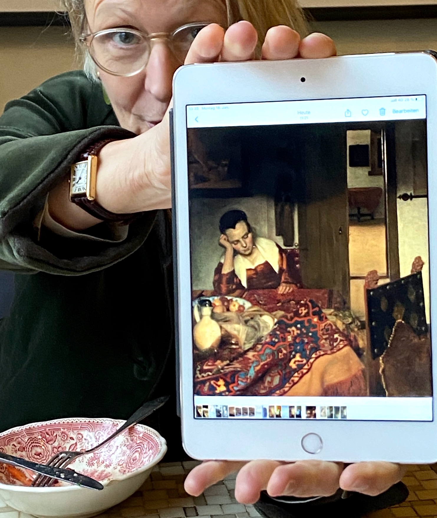 Es folgt die “Schlafende Magd”, auch hier im Hintergrund ein Bild im Bild. Jedes Detail auf dem Tisch erzählt: ein leeres Weinglas, die Geste der Acedia, der Trägheit, wieder die Früchte … Ihr könnte Euch selbst daran versuchen, der Tag wird nicht langweilig werden.