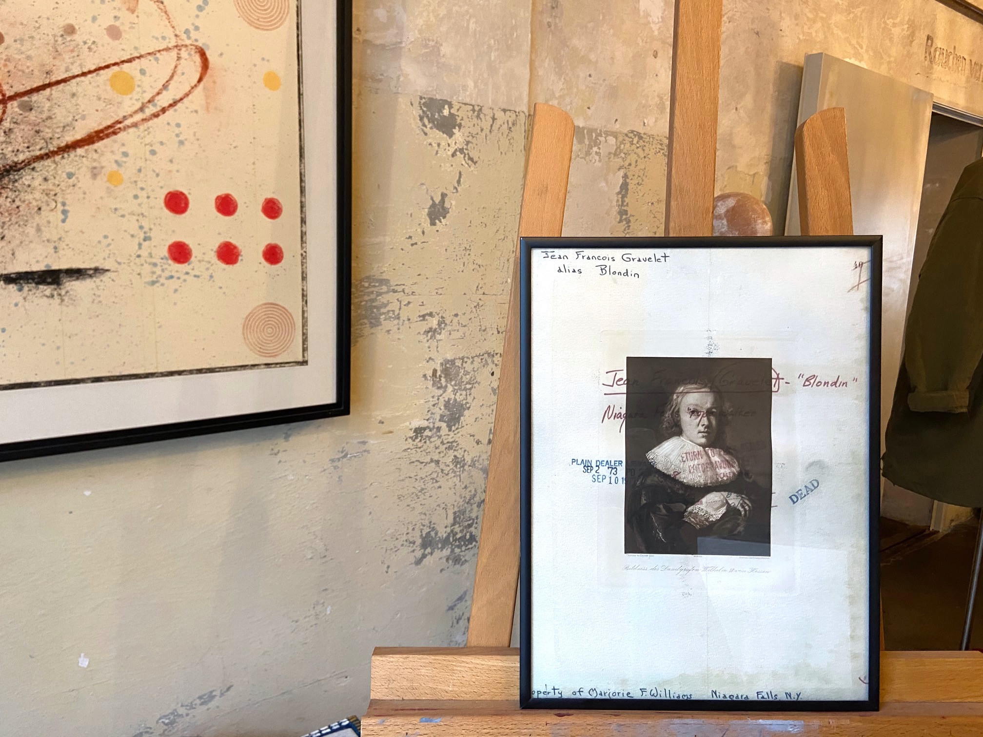 An den Wänden hängen die Malereien von Luca Lanzi und auf der Staffelei eine kleine konzeptionelle Arbeit von Peter Bücher (Leihgabe Galerie Holthoff). Ähnliche Arbeiten auf Papier gerahmt, ca. € 900.