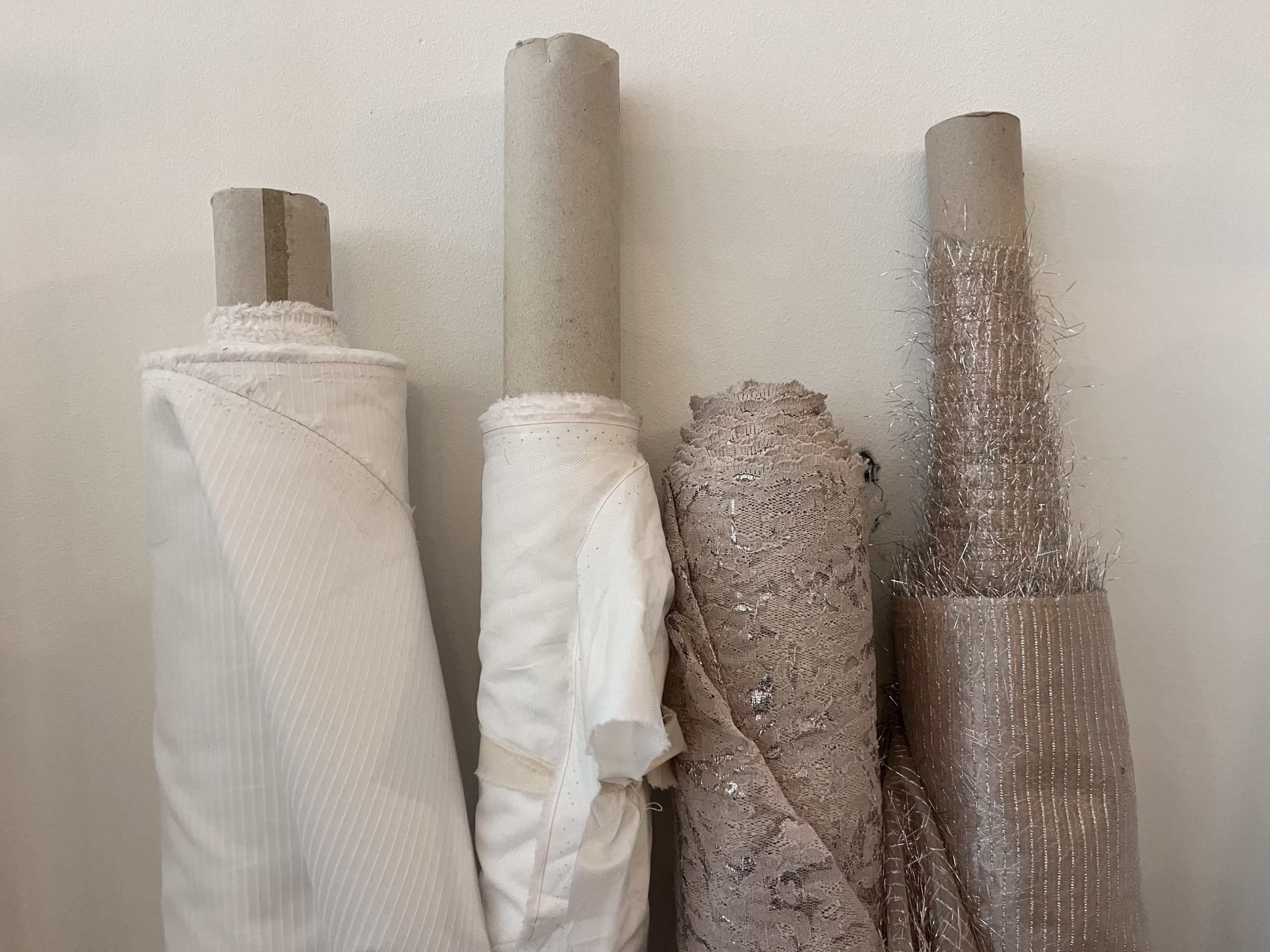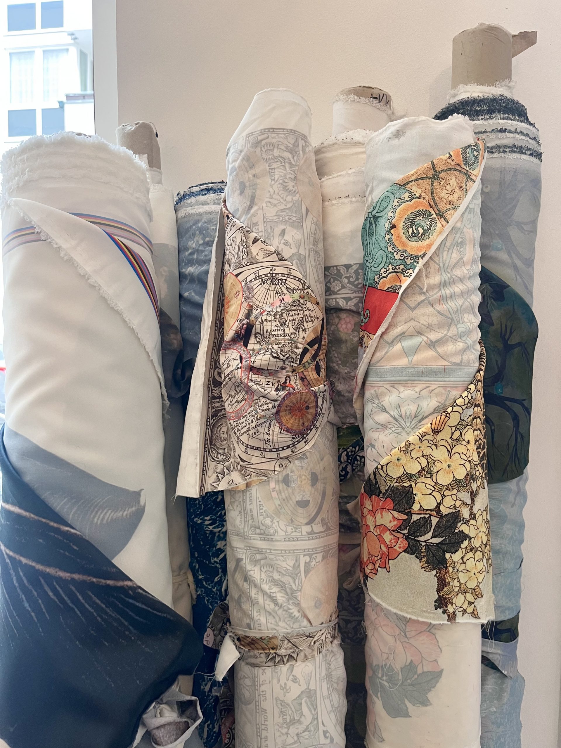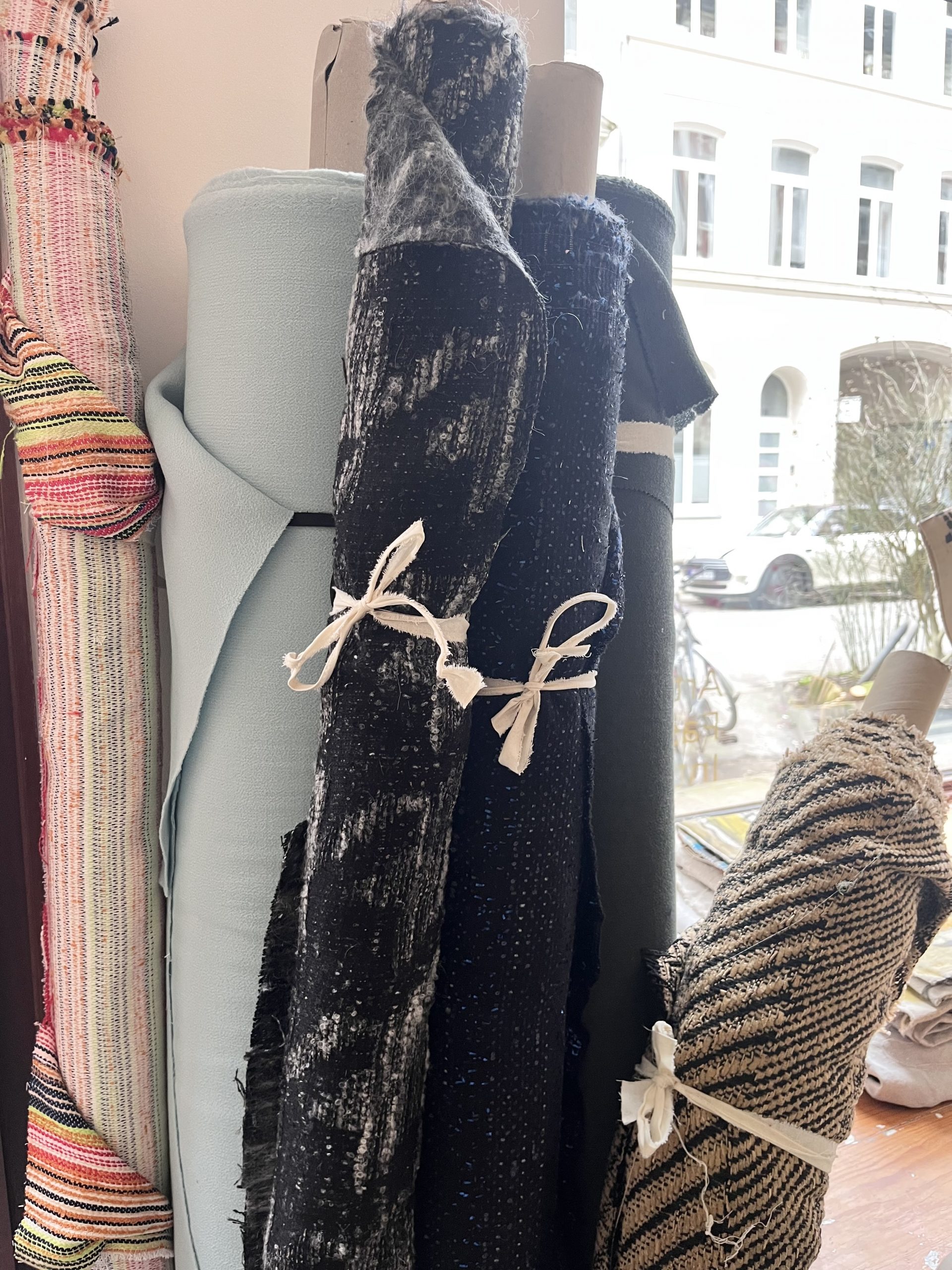 In den Ecken lauern die Stoffe aus dem Archiv, die Streifen-Jacquards aus Seide-Baumwolle, der Bouclé in tiefblau, die Wollbouclés aus moosgrün und türkis.
