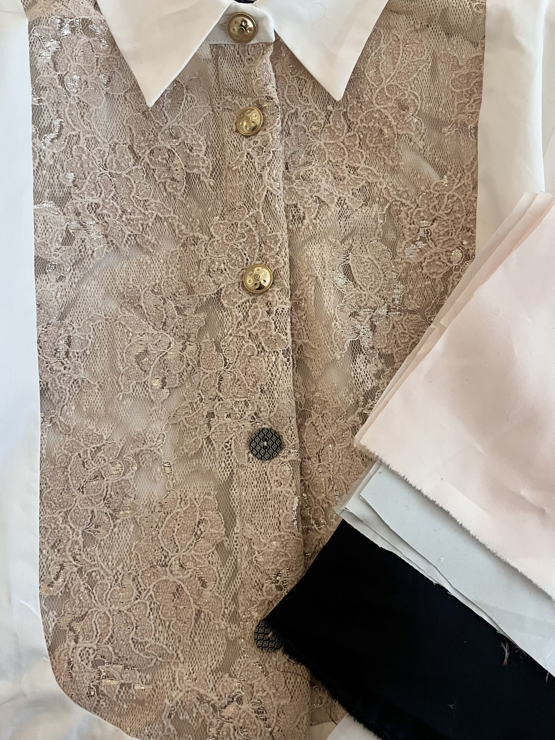 Auch die Smoking Bluse lässt sich zu einer eigenen Kreation machen von Uni-Baumwollstoff (weiß, creme, rosa, hellblau, dunkelblau, schwarz) mit Couture-Varianten von Plissee, Spitze und Glitzerfransen.