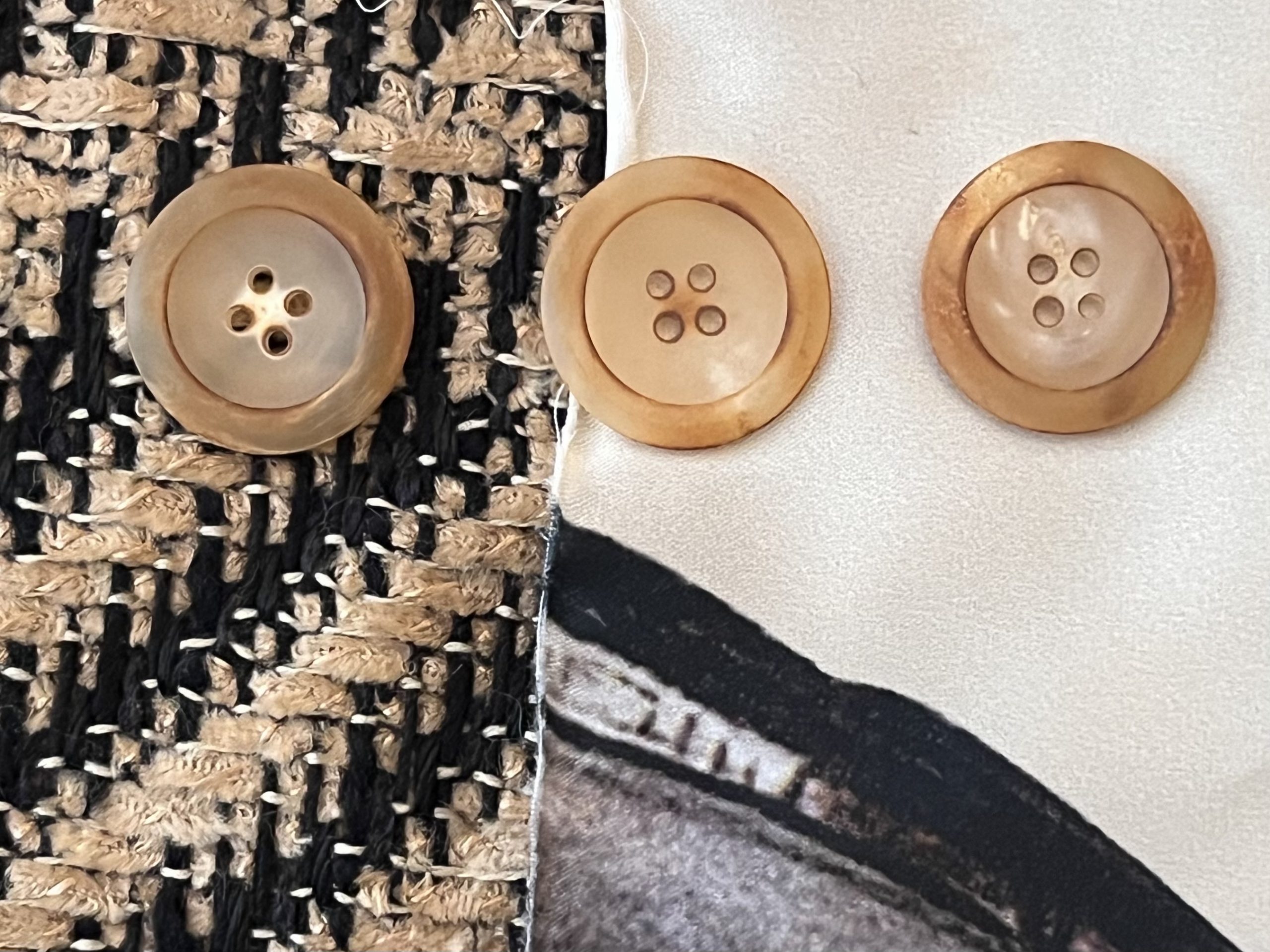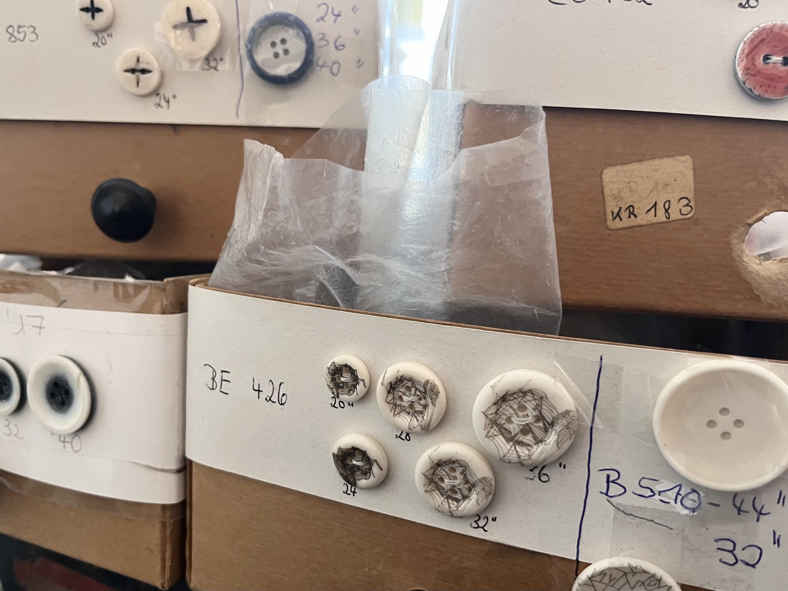 Als letztes kommt der Griff in die Knopf-Schatuellen mit einzigartigen Permutt, Horn, Kokos und Emaille-Kreationen. Überall liegen Zutaten, ähnlich wie in den Ateliers der großen Meister*innen.