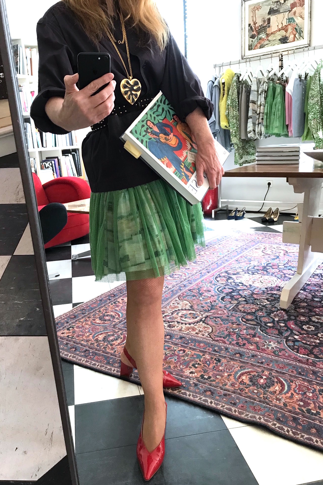 Abb: “Malerkittel” Yves Saint Laurent aus den 1970er Jahren (€650), Gürtel Yves Saint Laurent (€650), Tütü Roma e Toska (€698), Taglia Scapre Lackschuhe (€390)