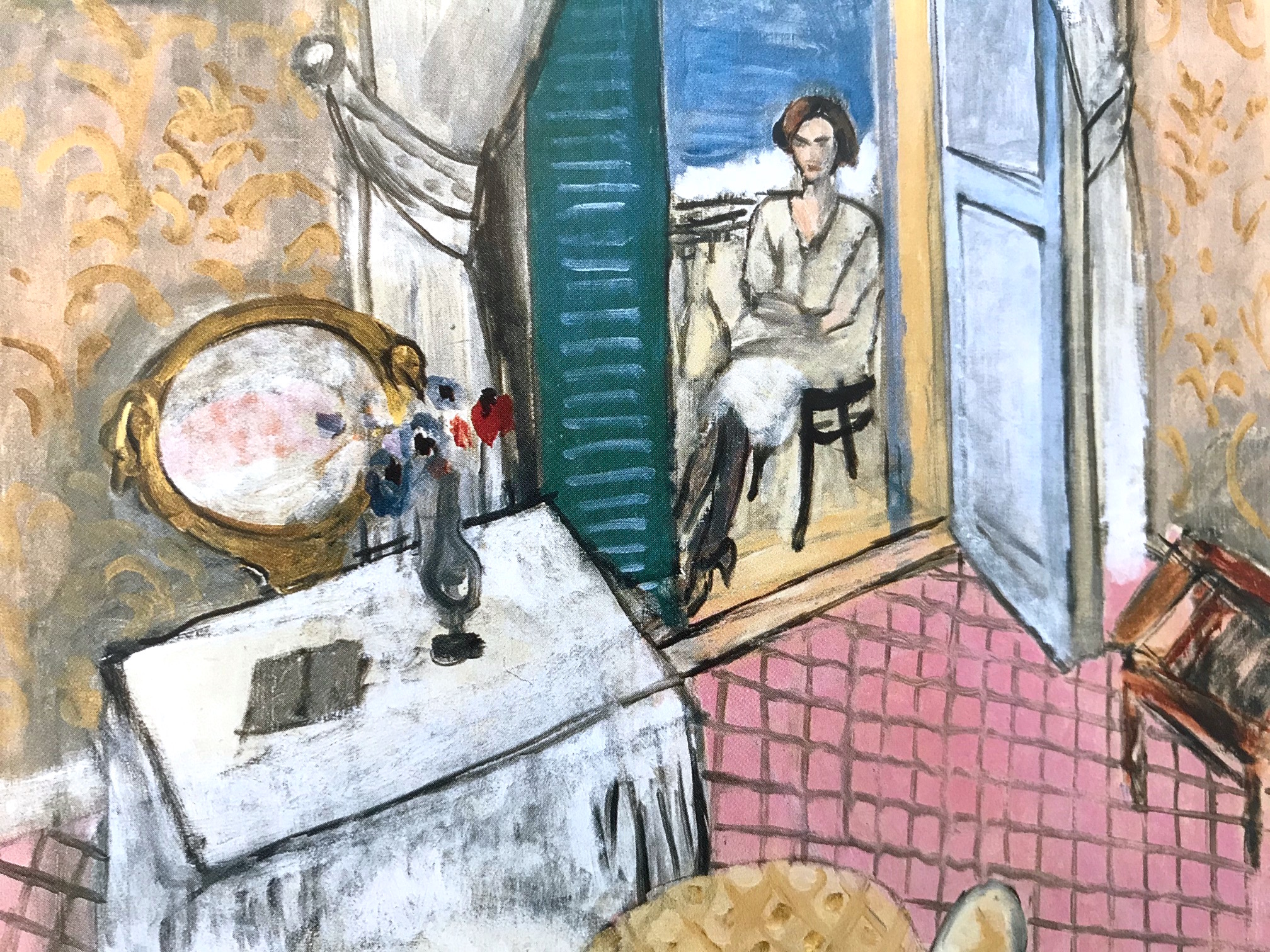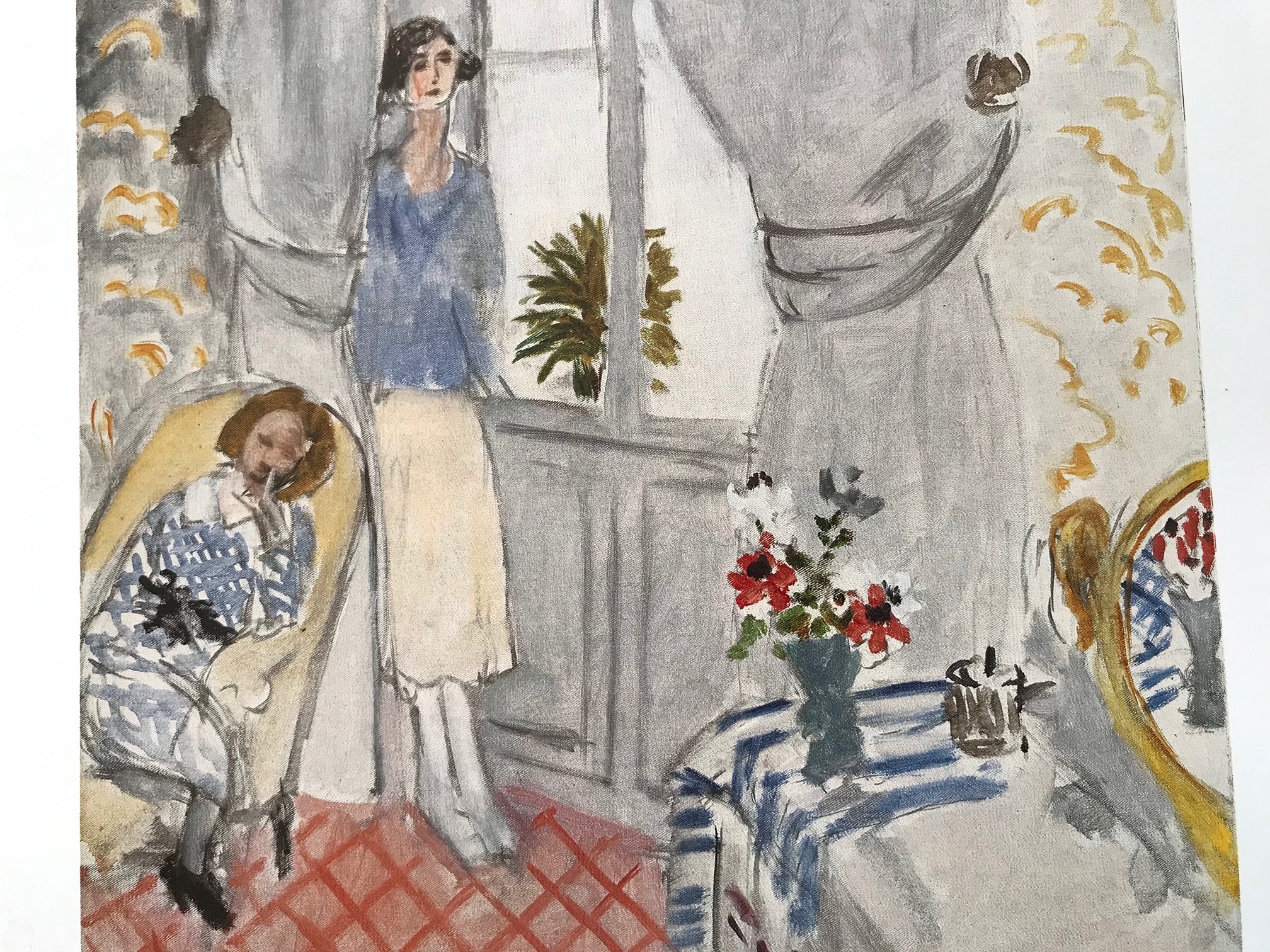 Es ist das Atelier des Künstlers, die Gegenstände sind über die Fläche verteilt, es gibt kein vorne und hinten, sondern nur ein oben und unten, rechts und links. Matisse interessierte nicht mehr die Wiedergabe der Illusion eines Raumes. Das physische Zimmer wird zu einer Welt von Farbe und Komposition. Es entsteht eine Idee von Innen, aber wo ist das Außen?