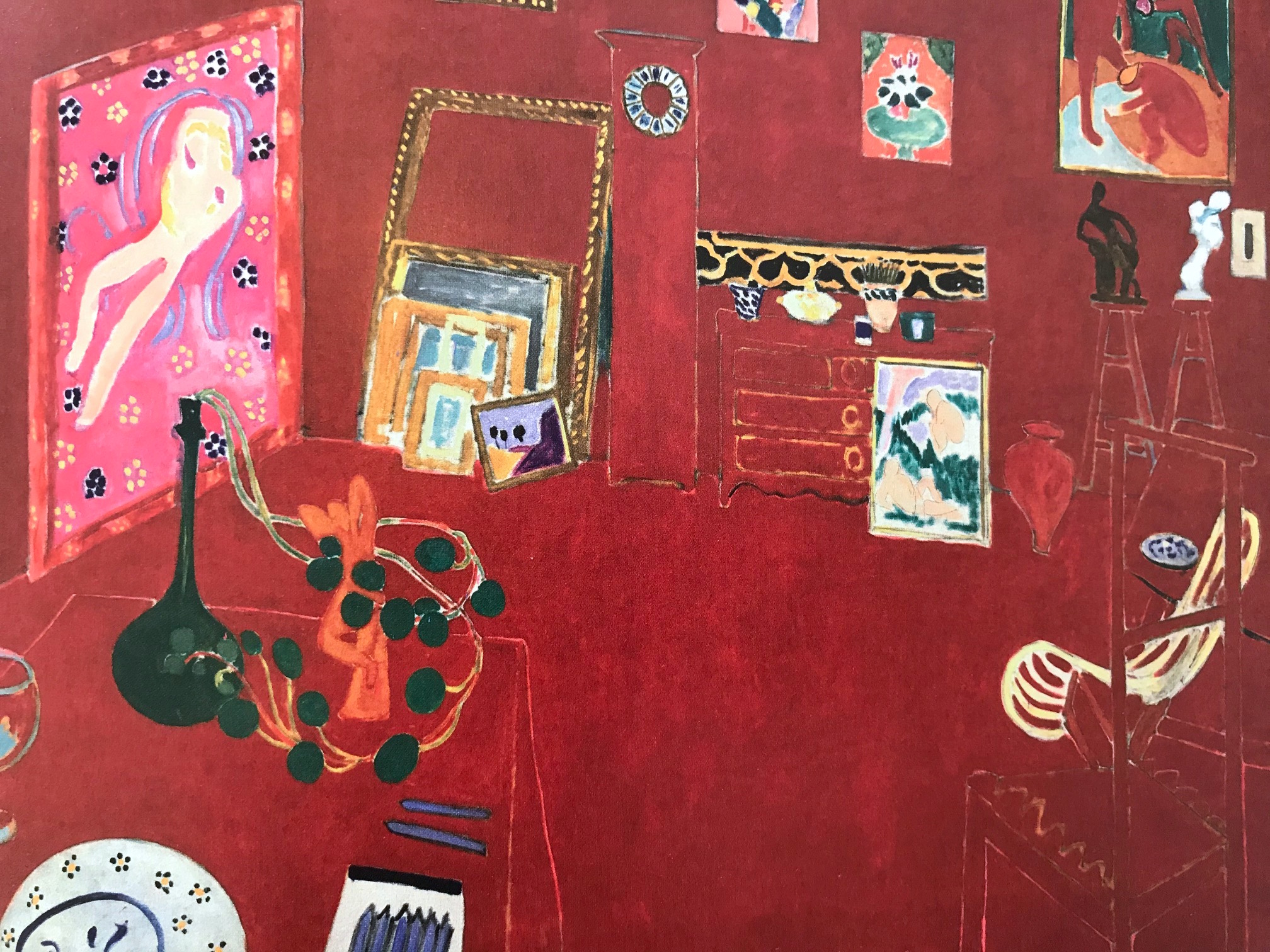 Es ist für mich eine Inspiration, ebenfalls ein Werk vorzustellen, das in diese Zeit passt: “L’Atelier Rouge” von Henri Matisse, von 1911. Das Gemälde hängt im Museum of Modern Art in New York und ist für damalige Verhältnisse mit 181 x 219 cm riesig groß. Wenn man davor steht, fühlt man sich beinahe eingehüllt in diese unglaubliche Flut von Rot.