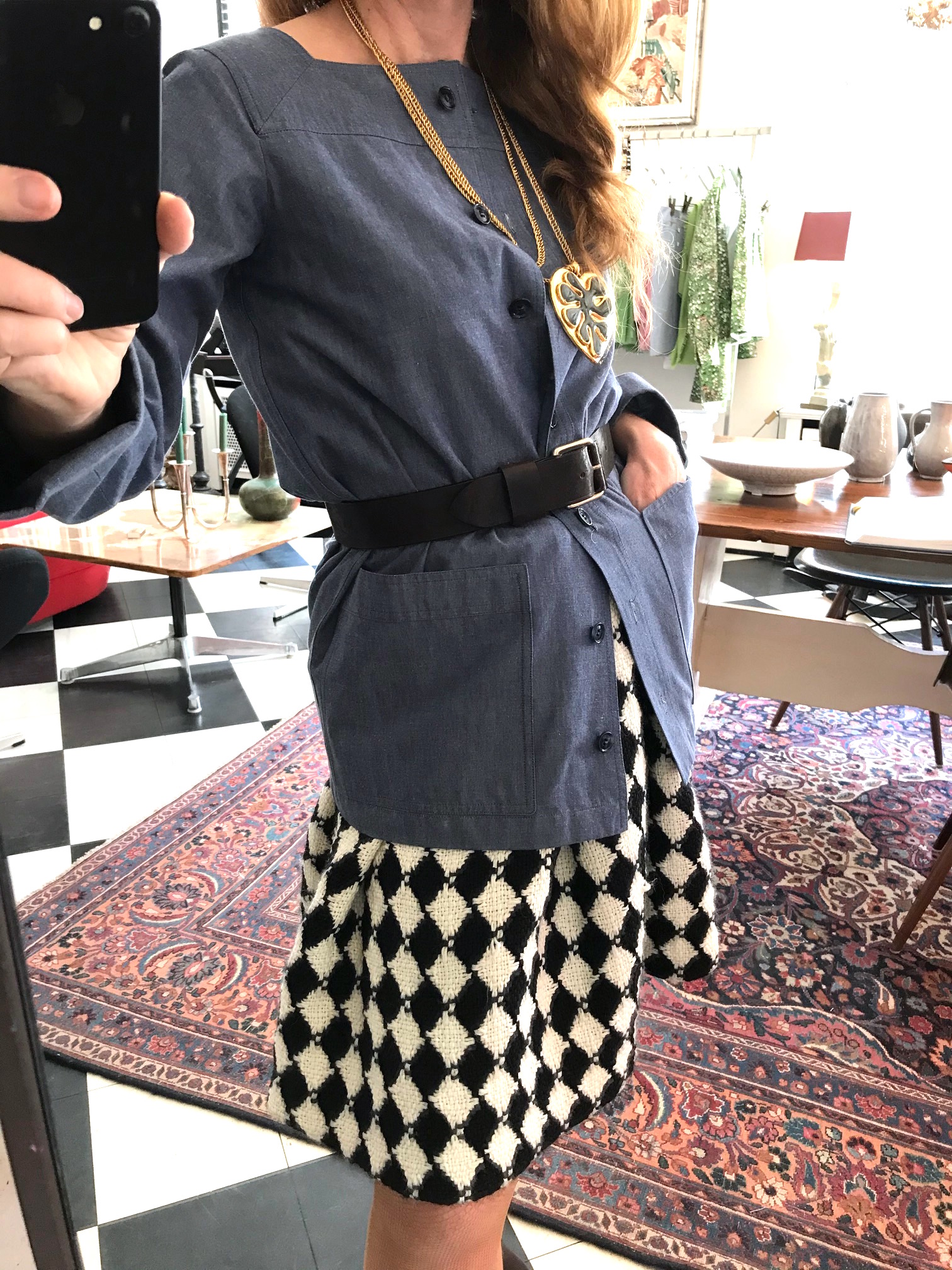 Zur Bildbesprechung von Matisse passen die “Malerkittel”, die Yves Saint Laurent seit den 1970er Jahren immer wieder entworfen hat. Sie sehen so “aus der Zeit gefallen aus” und sind doch von bestechender Aktualität, was den kastig-lässigen Schnitt anbelangt, die großen Seitentaschen und den kleinen Kragen.