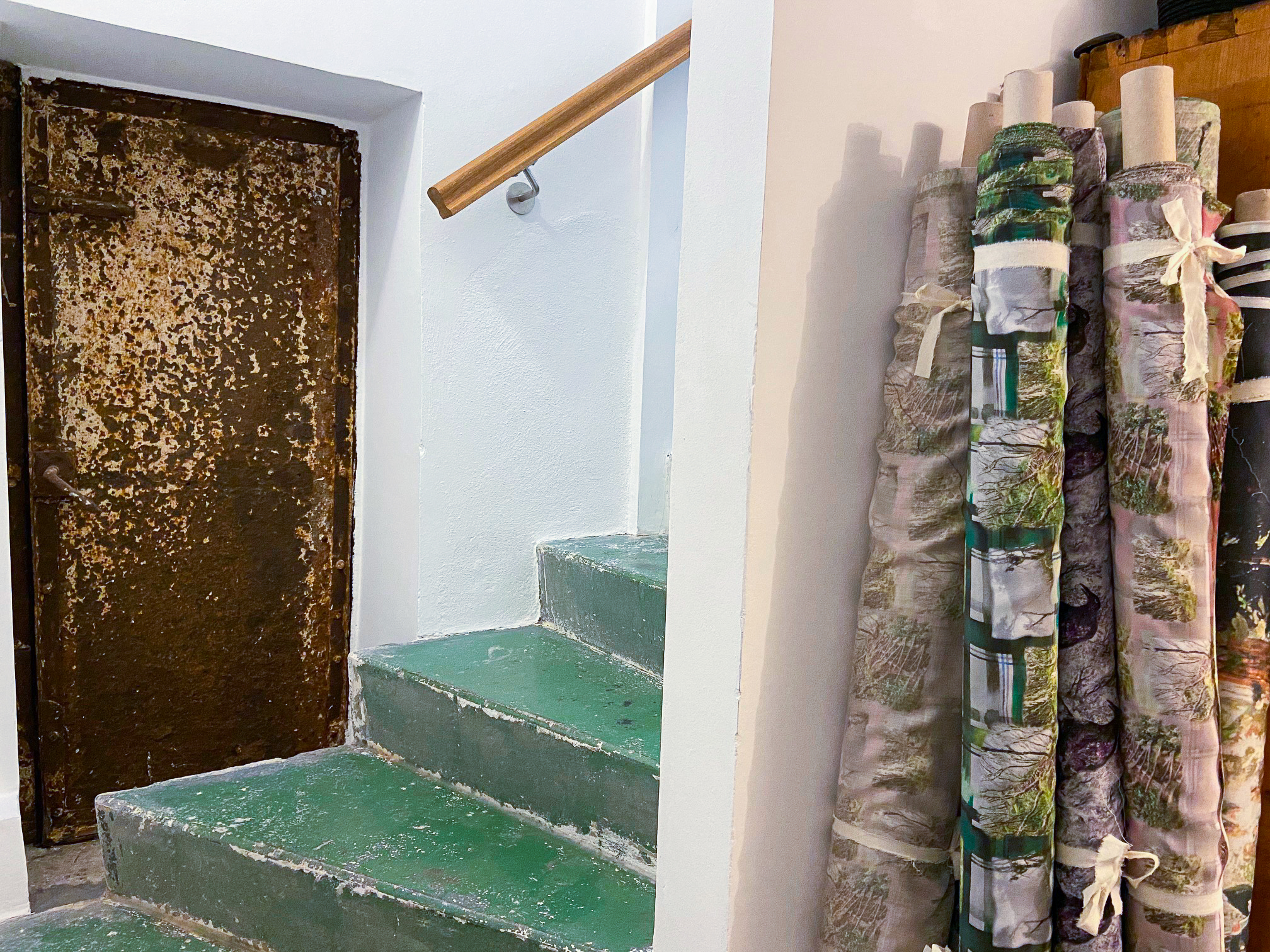 Roma hatte Recht, als sie schmunzelnd prognostizierte, dass ich das Untergeschoss lieben werde. Auf jeden Fall wird es schön dort und inspirierend mit Monique mitten drin, dem Rattern der Maschinen, der Musik im Hintergrund, den Materialien in den Schränken und den Bildern an der Wand.