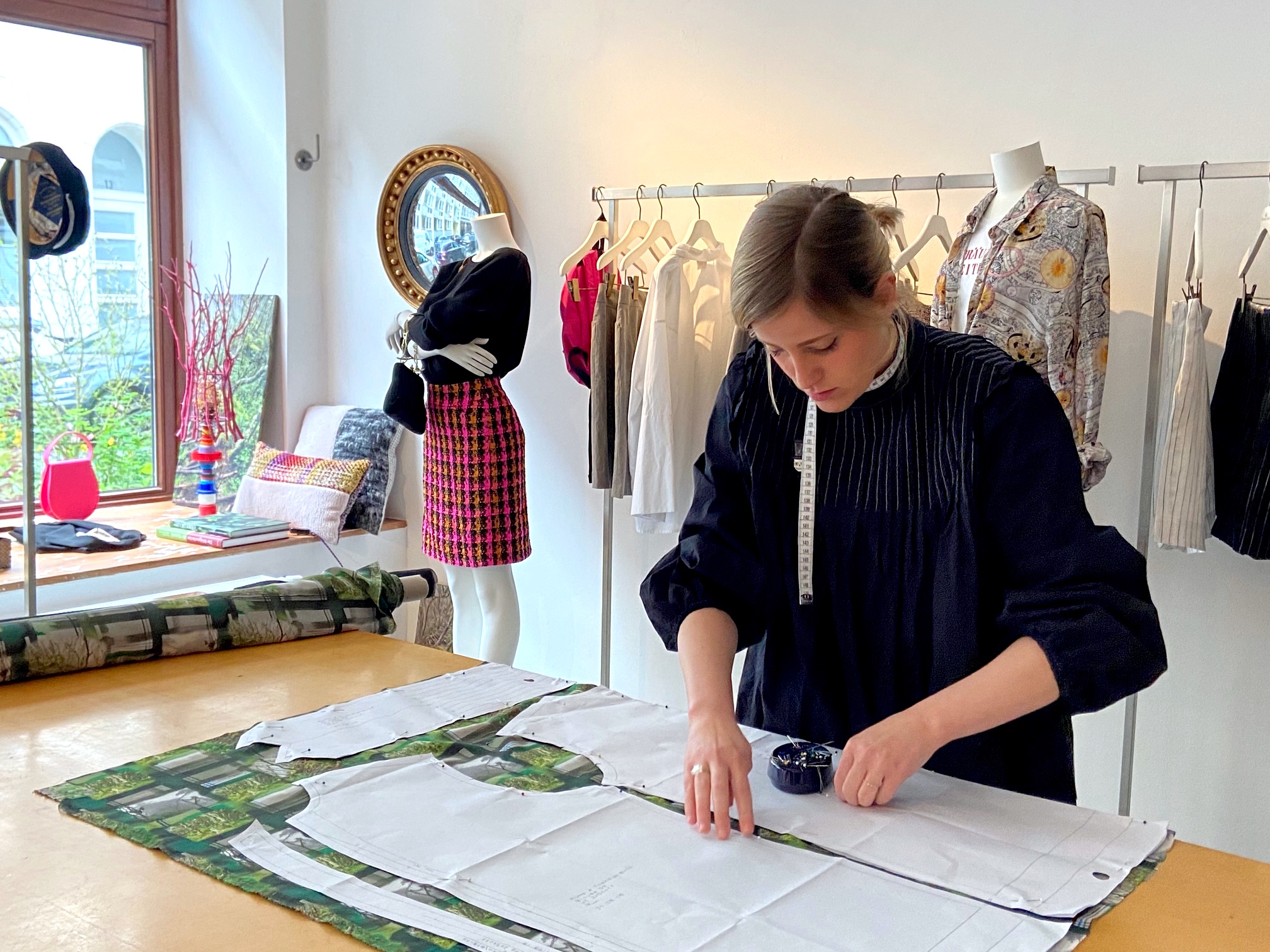 Oben schneidet sie die neuen Modelle zu. Die Werkstatt befindet sich im Untergeschoss, dem berühmten “Bauch der Kreation”, der “Arche Noah” von Roma e Toska. An den Wänden hängen die Schnitte, entstehen erste Collagen aus Fotos, Bildern und Schnipsel, die uns wieder zu Neuem verleiten. Leise läuft klassische Musik.
