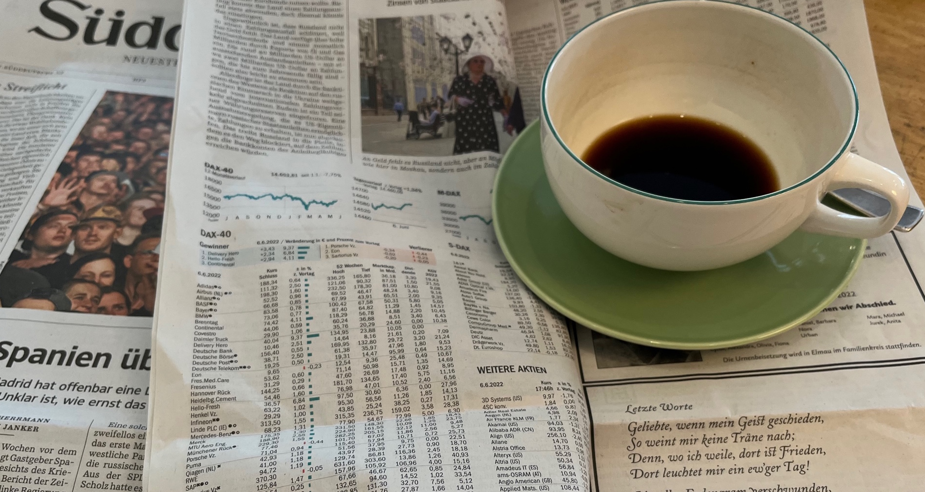 Rechts das Croissant, links der Kaffee mit der Zeitung. Wie ich gestern im Gespräch feststellte, bin ich nicht die einzige, die intensiv die Todesanzeigen in der Süddeutschen Zeitung studiert, zwischen Wirtschaft und Sport, gleich neben den Börsendaten.