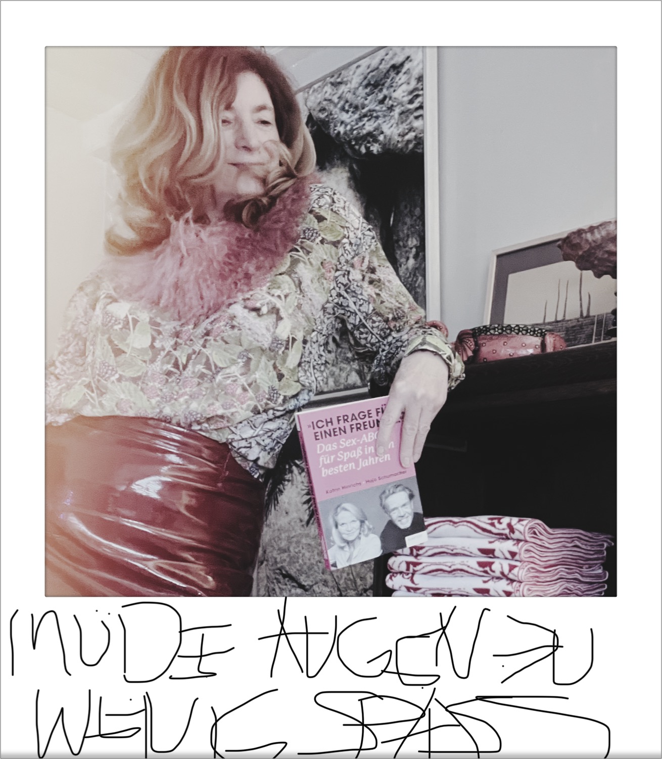 Ach, ich hatte noch vergessen zu erwähnen, dass mir mein Spiegelbild vorhin im Badezimmer überhaupt nicht gefiel: neue Falten, wo auch immer die herkamen. Aber, wie ich gleich auf Seite 11 lesen darf: “Sex macht schön, Sex trainiert den Körper, Sex hebt das Selbstbewusstsein … verbrennt Kalorien und strafft das Bindegewebe.”
