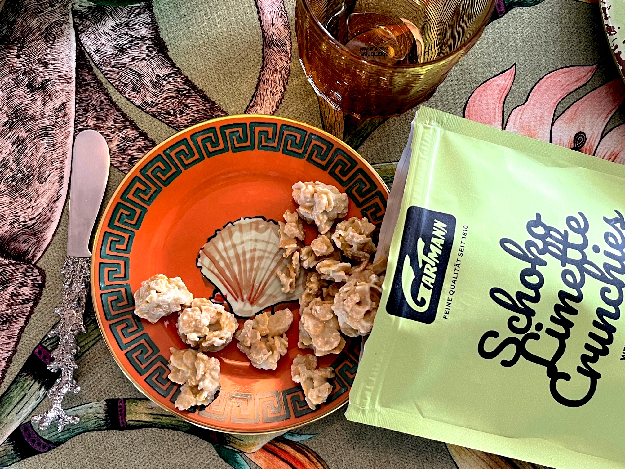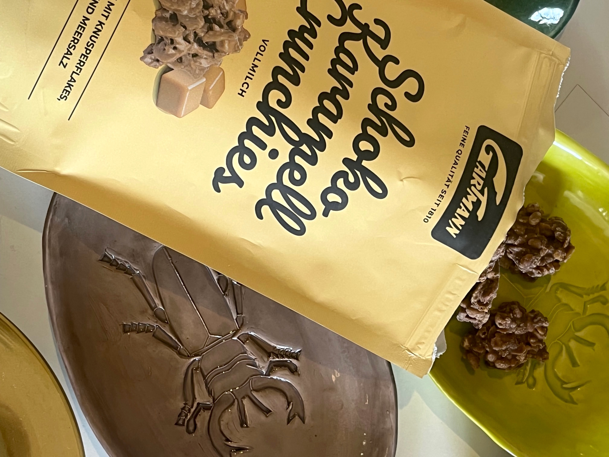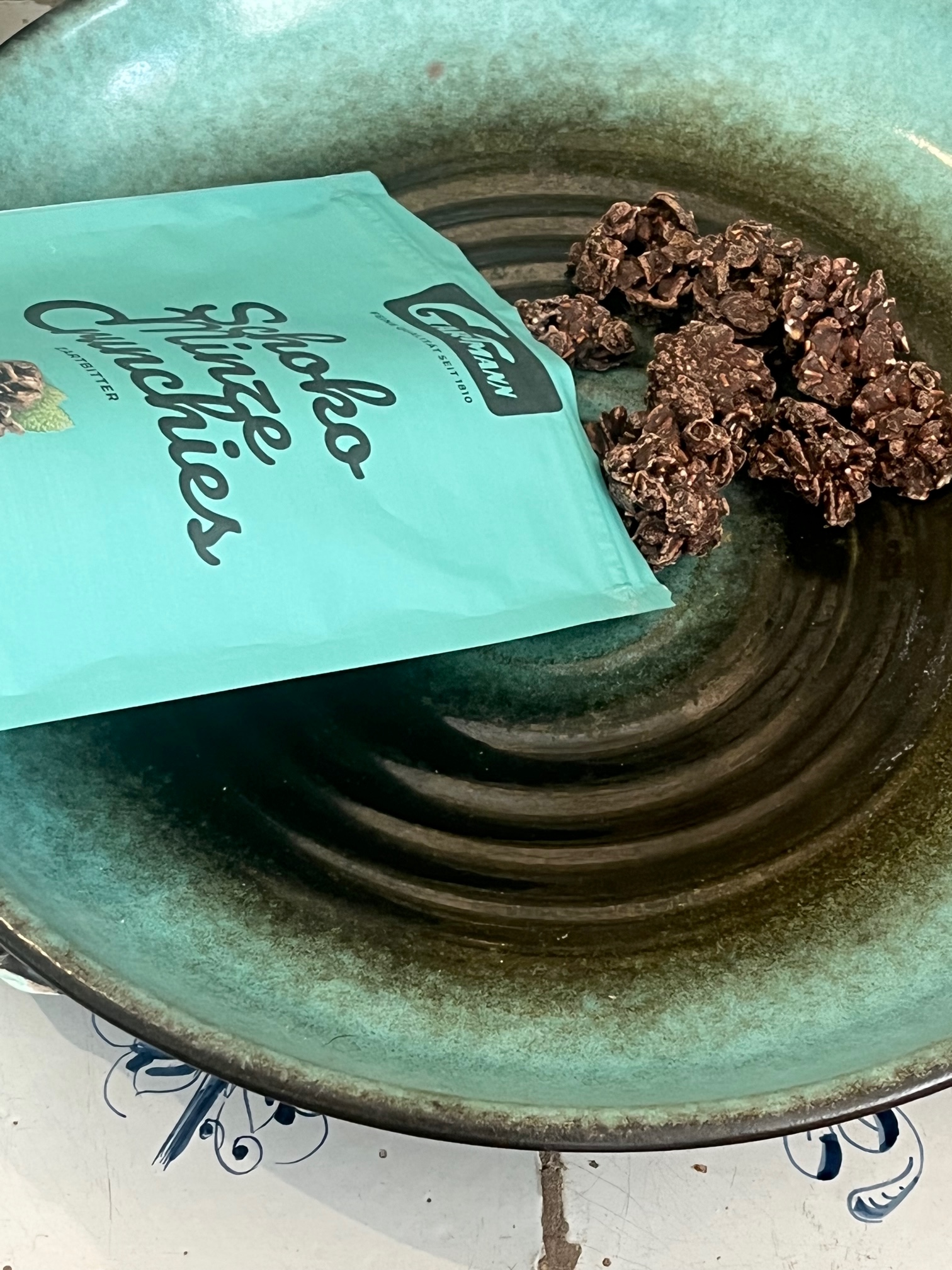 Ich probiere die Schoko-Minze-Crunchies. Köstlich, überflüssig zu erwähnen, dass ich Schokolade liebe. Die Antwort auf meine Frage “Warum sie so gut schmecken?” steht auf der Rückseite der Verpackung: