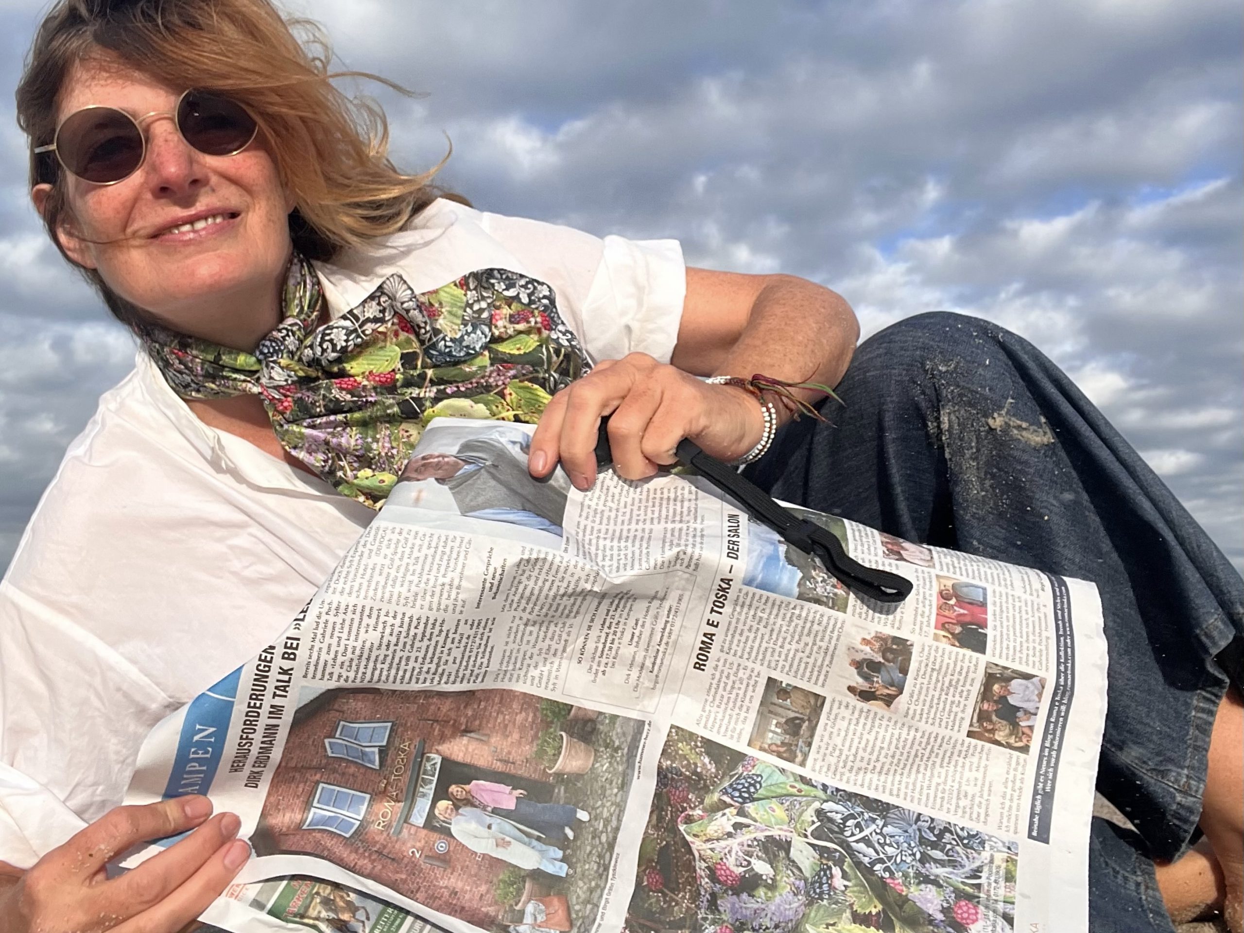 Ups, eine Windböe, schon fliegt die Zeitung weg. Jeanshose Dior, privat.