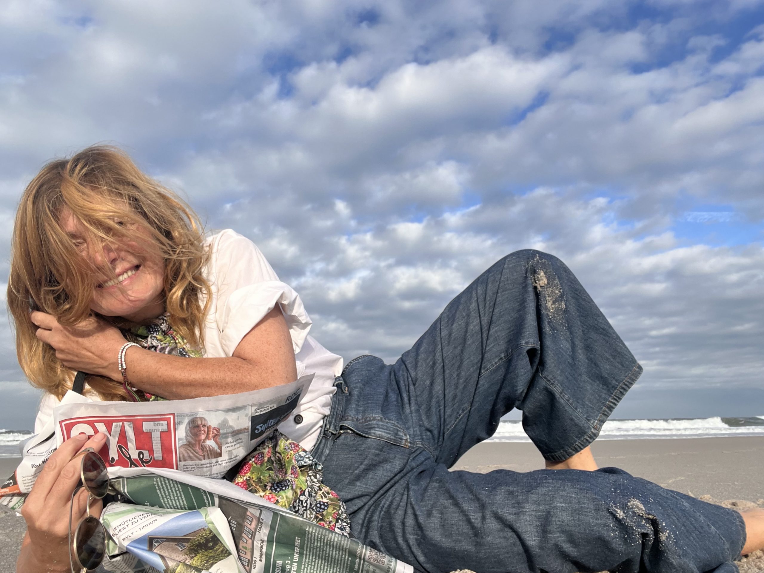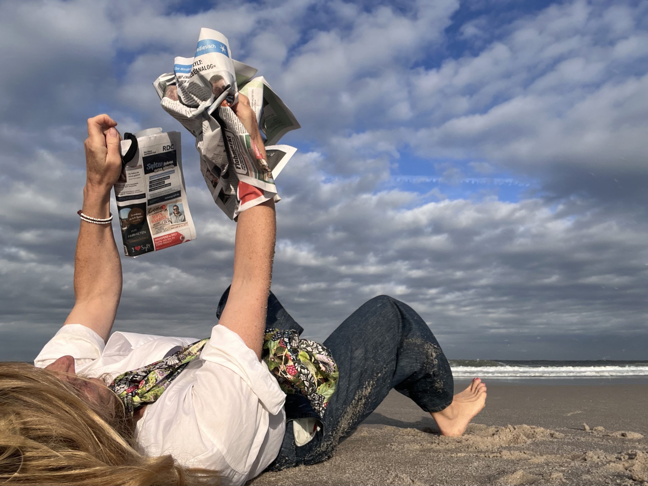 Der erste Tag des Herbstes. Der Wind weht kräftig aus südlichen Richtungen, als wollte er die Vögel locken, sich auf den Weg zu machen. Dennoch ist es mild, ja beinahe warm, so dass die Bluse mit dem Seidentuch gerade richtig ist. In der Zeitung steht unser nächster Event. Für ein paar hübsche Bilder am Strand, versuche ich die Seite aufzuschlagen mit der Doppelankündigung für “Leben & Liebe anlog”.